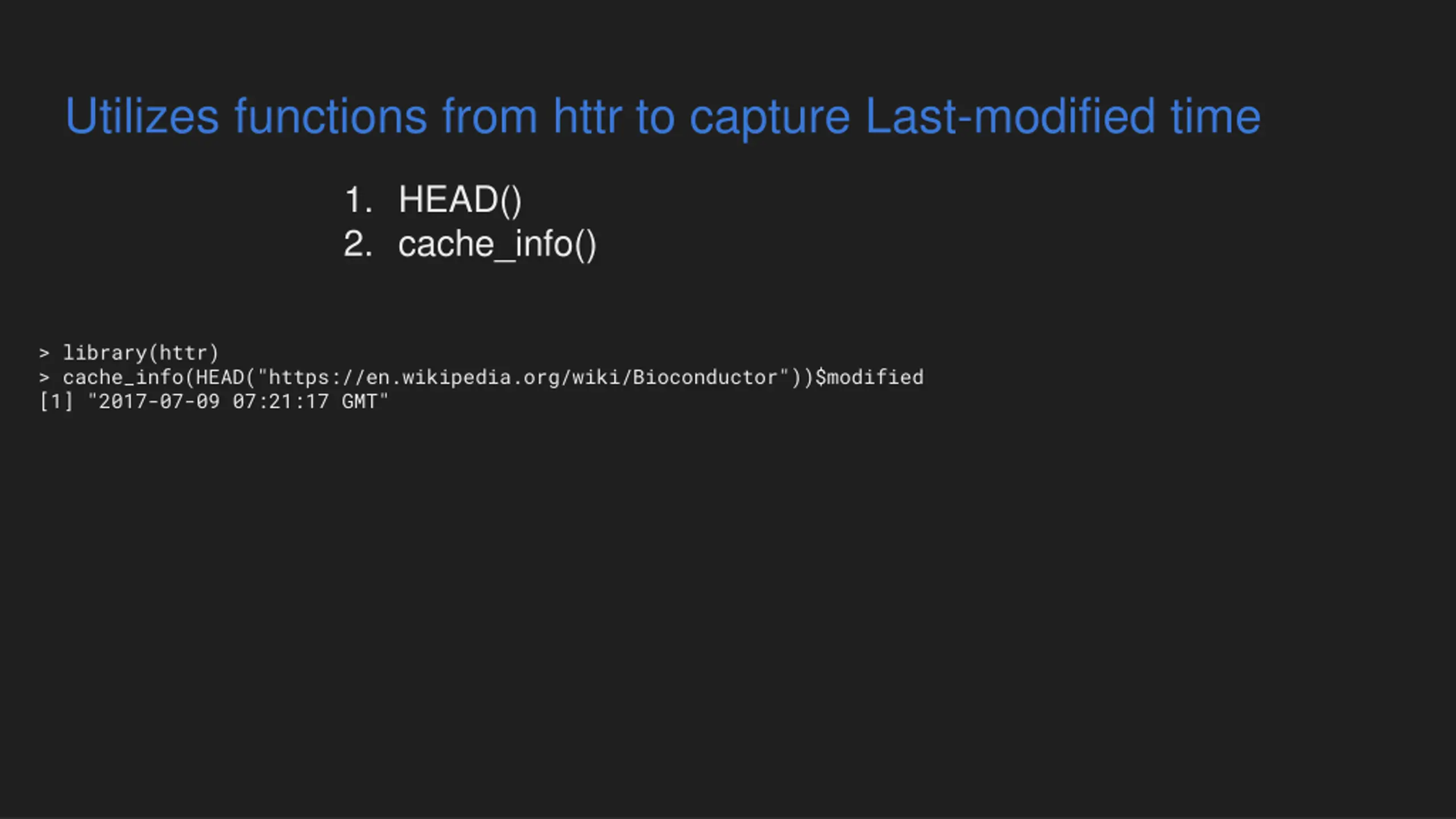 Utilizes functions from httr to capture Last-modified time 1. HEAD() 2. cache_info() > library(httr) > cache_info(HEAD("https://en.wikipedia.org/wiki/Bioconductor"))$modified [1] "2017-07-09 07:21:17 GMT"