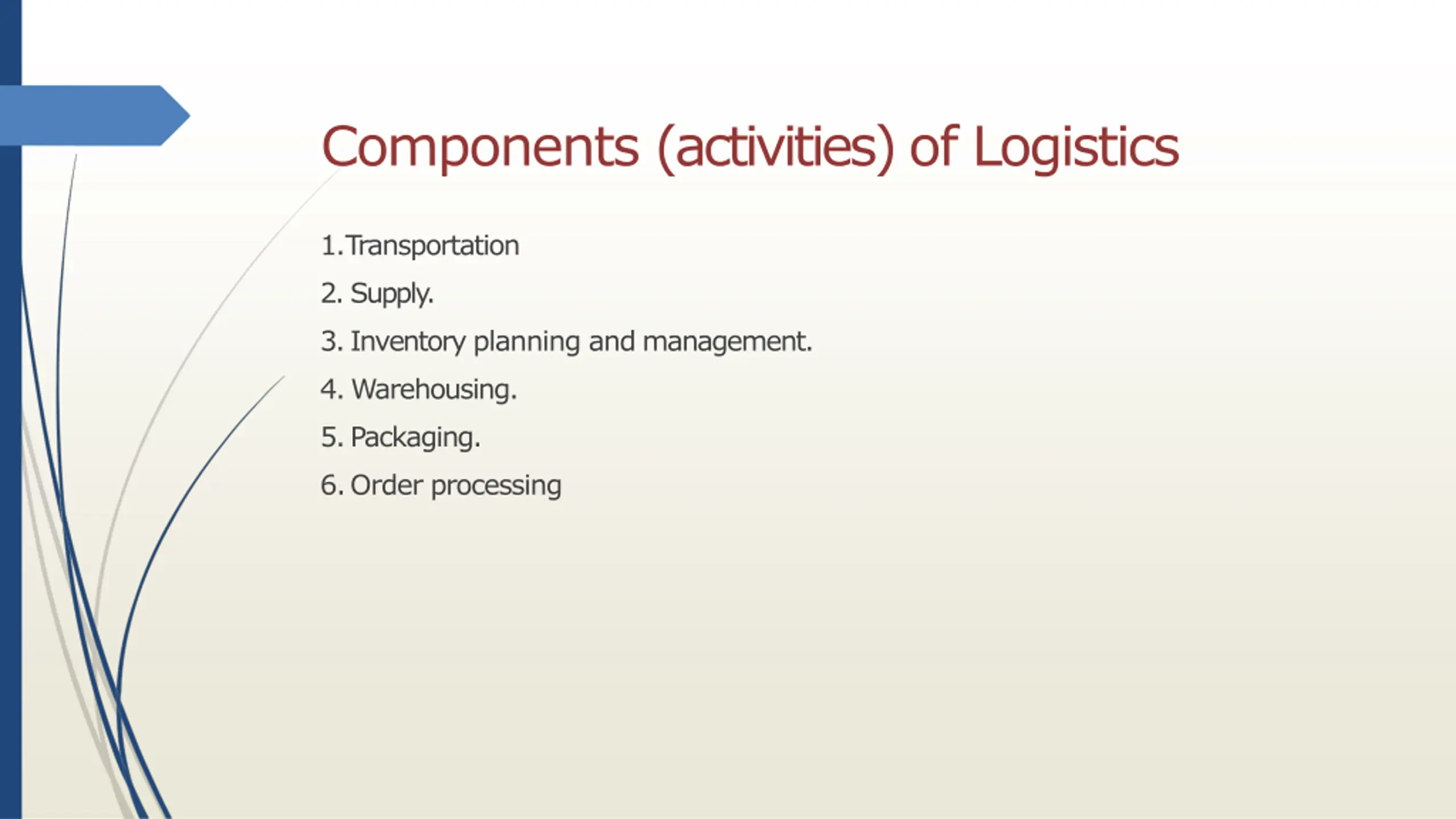 Components (activities) of Logistics 1.Transportation 2.Supply. 3.Inventory planning and management. 4.Warehousing. 5.Packaging. 6.Order processing