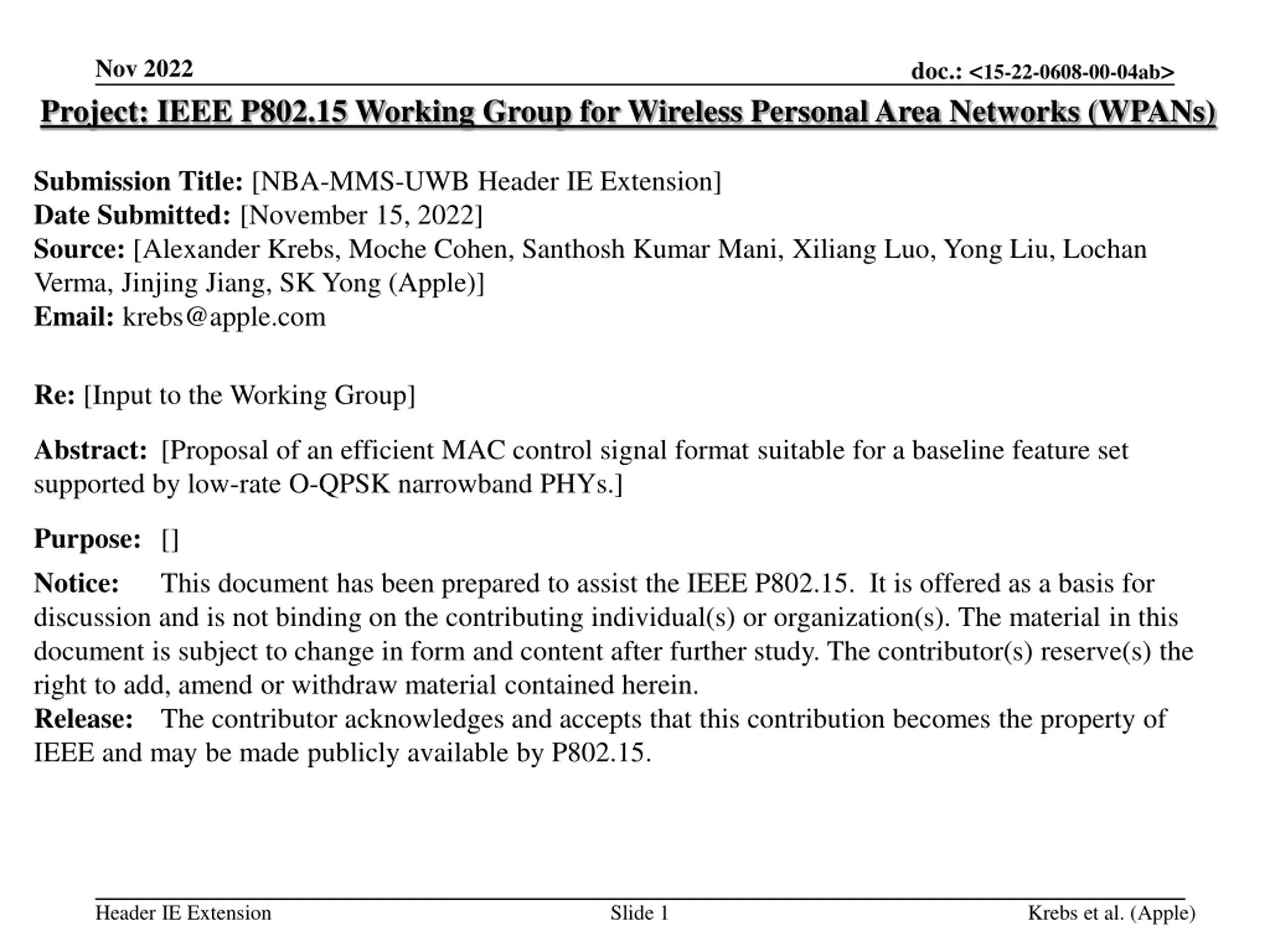 Nov 2022 doc.: <15-22-0608-00-04ab> Project: IEEE P802.15 Working Group for Wireless Personal Area Networks (WPANs) Submission Title: [NBA-MMS-UWB Header IE Extension] Date Submitted: [November 15, 2022] Source: [Alexander Krebs, Moche Cohen, Santhosh Kumar Mani, Xiliang Luo, Yong Liu, Lochan Verma, Jinjing Jiang, SK Yong (Apple)] Email: krebs@apple.com Re: [Input to the Working Group] Abstract: [Proposal of an efficient MAC control signal format suitable for a baseline feature set supported by low-rate O-QPSK narrowband PHYs.] Purpose: [] Notice: discussion and is not binding on the contributing individual(s) or organization(s). The material in this document is subject to change in form and content after further study. The contributor(s) reserve(s) the right to add, amend or withdraw material contained herein. Release: The contributor acknowledges and accepts that this contribution becomes the property of IEEE and may be made publicly available by P802.15. This document has been prepared to assist the IEEE P802.15. It is offered as a basis for Header IE Extension Slide 1 Krebs et al. (Apple)