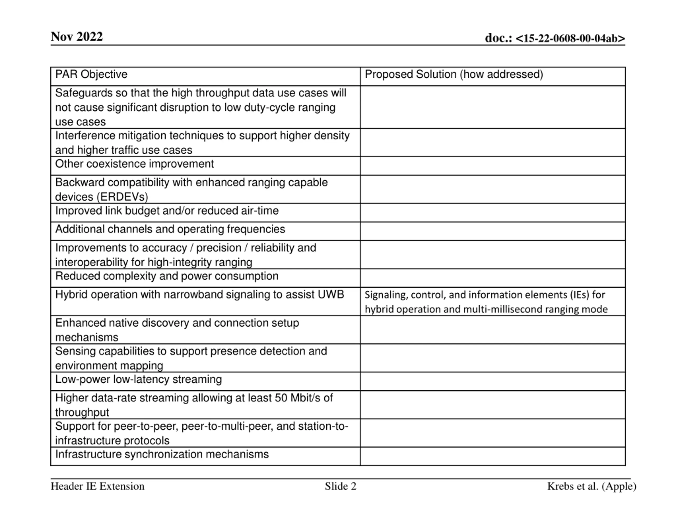 Nov 2022 doc.: <15-22-0608-00-04ab> PAR Objective Safeguards so that the high throughput data use cases will not cause significant disruption to low duty-cycle ranging use cases Interference mitigation techniques to support higher density and higher traffic use cases Other coexistence improvement Backward compatibility with enhanced ranging capable devices (ERDEVs) Improved link budget and/or reduced air-time Additional channels and operating frequencies Improvements to accuracy / precision / reliability and interoperability for high-integrity ranging Reduced complexity and power consumption Hybrid operation with narrowband signaling to assist UWB Proposed Solution (how addressed) Signaling, control, and information elements (IEs) for hybrid operation and multi-millisecond ranging mode Enhanced native discovery and connection setup mechanisms Sensing capabilities to support presence detection and environment mapping Low-power low-latency streaming Higher data-rate streaming allowing at least 50 Mbit/s of throughput Support for peer-to-peer, peer-to-multi-peer, and station-to- infrastructure protocols Infrastructure synchronization mechanisms Header IE Extension Slide 2 Krebs et al. (Apple)