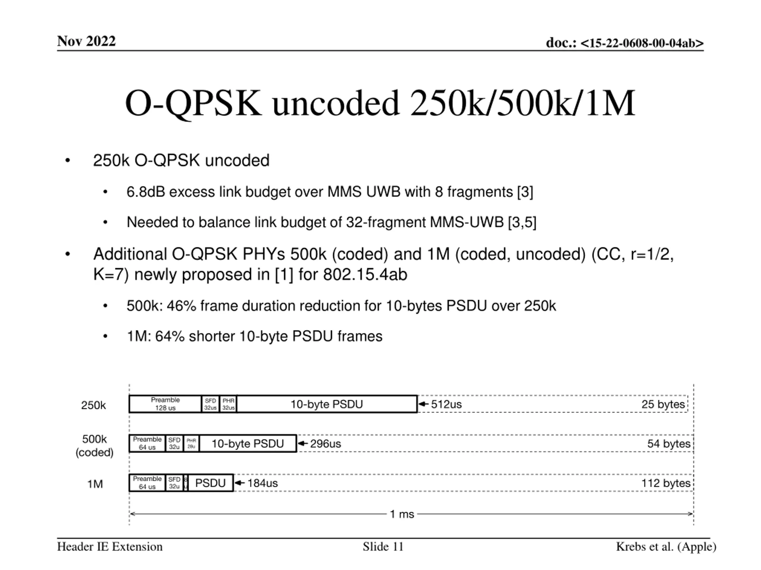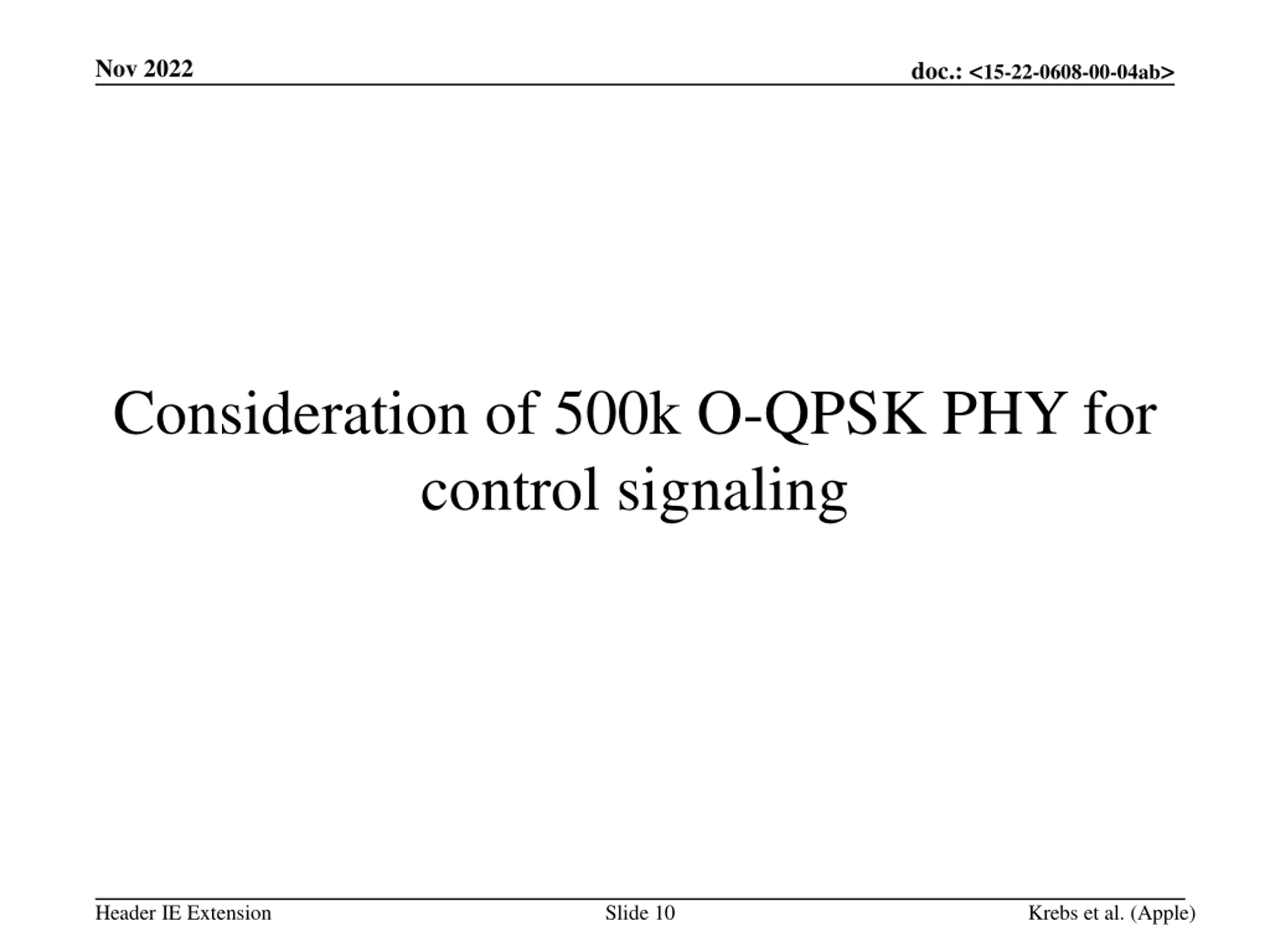 Nov 2022 doc.: <15-22-0608-00-04ab> Consideration of 500k O-QPSK PHY for control signaling Header IE Extension Slide 10 Krebs et al. (Apple)