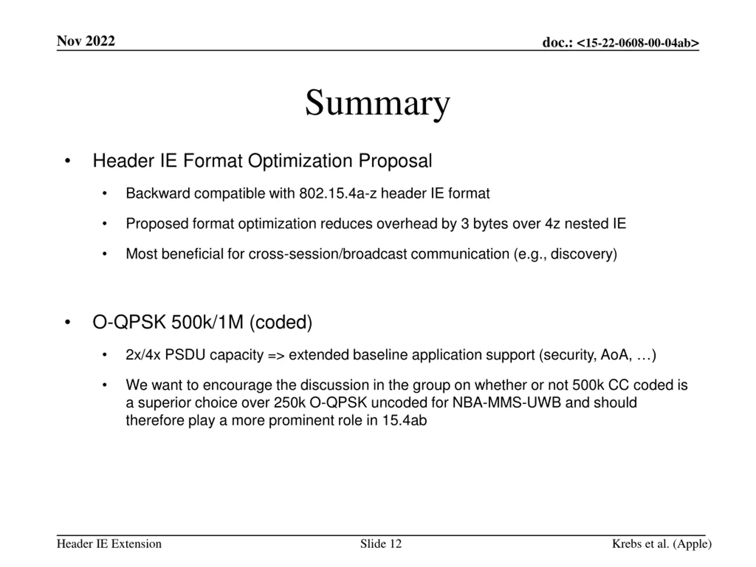 Nov 2022 doc.: <15-22-0608-00-04ab> O-QPSK uncoded 250k/500k/1M 250k O-QPSK uncoded 6.8dB excess link budget over MMS UWB with 8 fragments [3] Needed to balance link budget of 32-fragment MMS-UWB [3,5] Additional O-QPSK PHYs 500k (coded) and 1M (coded, uncoded) (CC, r=1/2, K=7) newly proposed in [1] for 802.15.4ab 500k: 46% frame duration reduction for 10-bytes PSDU over 250k 1M: 64% shorter 10-byte PSDU frames Header IE Extension Slide 11 Krebs et al. (Apple)