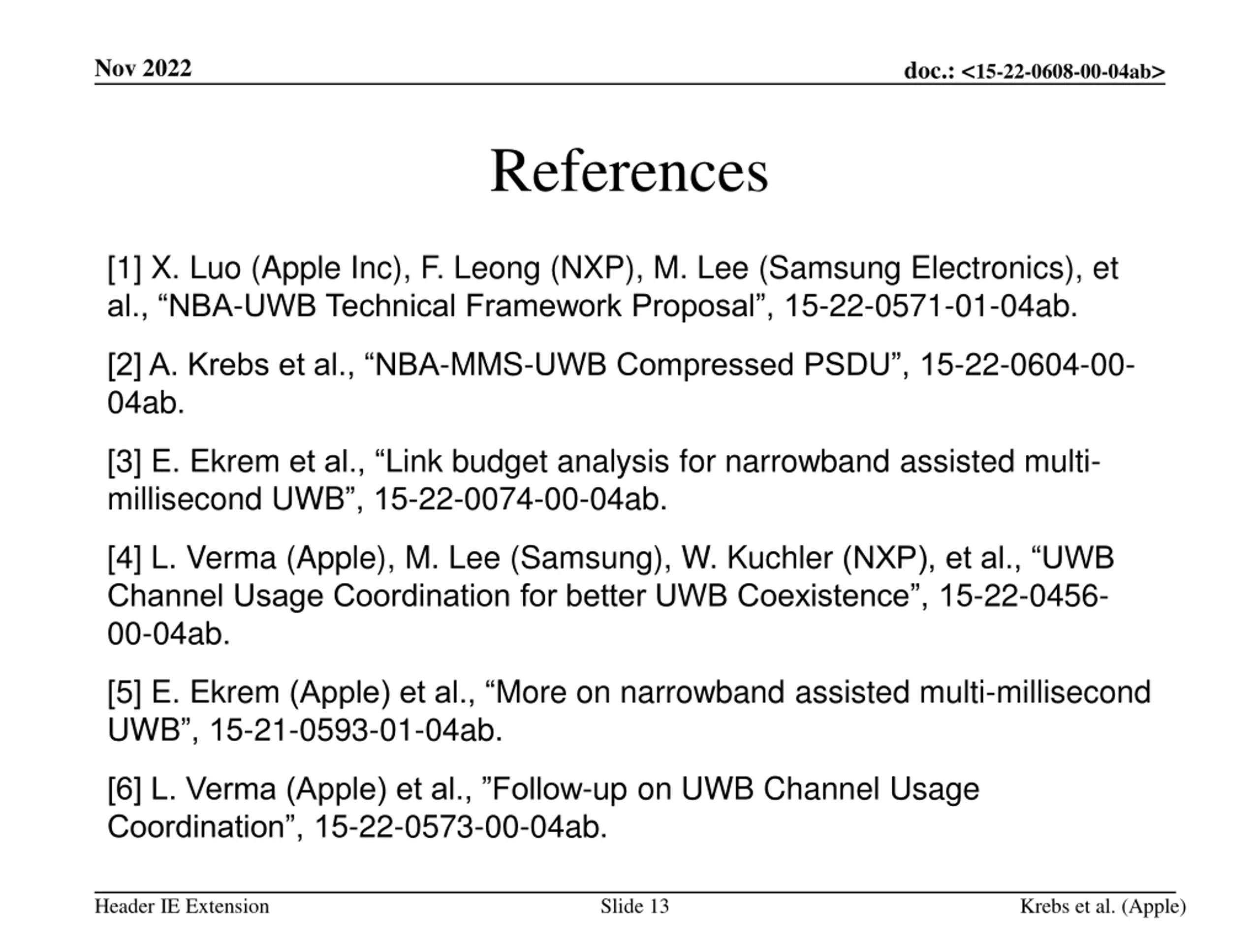 Nov 2022 doc.: <15-22-0608-00-04ab> References [1] X. Luo (Apple Inc), F. Leong (NXP), M. Lee (Samsung Electronics), et al., NBA-UWB Technical Framework Proposal , 15-22-0571-01-04ab. [2] A. Krebs et al., NBA-MMS-UWB Compressed PSDU , 15-22-0604-00- 04ab. [3] E. Ekrem et al., Link budget analysis for narrowband assisted multi- millisecond UWB , 15-22-0074-00-04ab. [4] L. Verma (Apple), M. Lee (Samsung), W. Kuchler (NXP), et al., UWB Channel Usage Coordination for better UWB Coexistence , 15-22-0456- 00-04ab. [5] E. Ekrem (Apple) et al., More on narrowband assisted multi-millisecond UWB , 15-21-0593-01-04ab. [6] L. Verma (Apple) et al., Follow-up on UWB Channel Usage Coordination , 15-22-0573-00-04ab. Header IE Extension Slide 13 Krebs et al. (Apple)