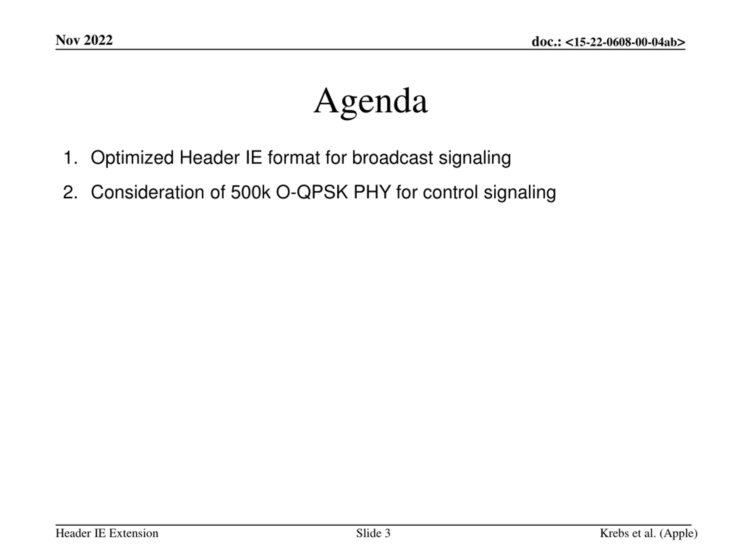 Nov 2022 doc.: <15-22-0608-00-04ab> Agenda 1. Optimized Header IE format for broadcast signaling 2. Consideration of 500k O-QPSK PHY for control signaling Header IE Extension Slide 3 Krebs et al. (Apple)