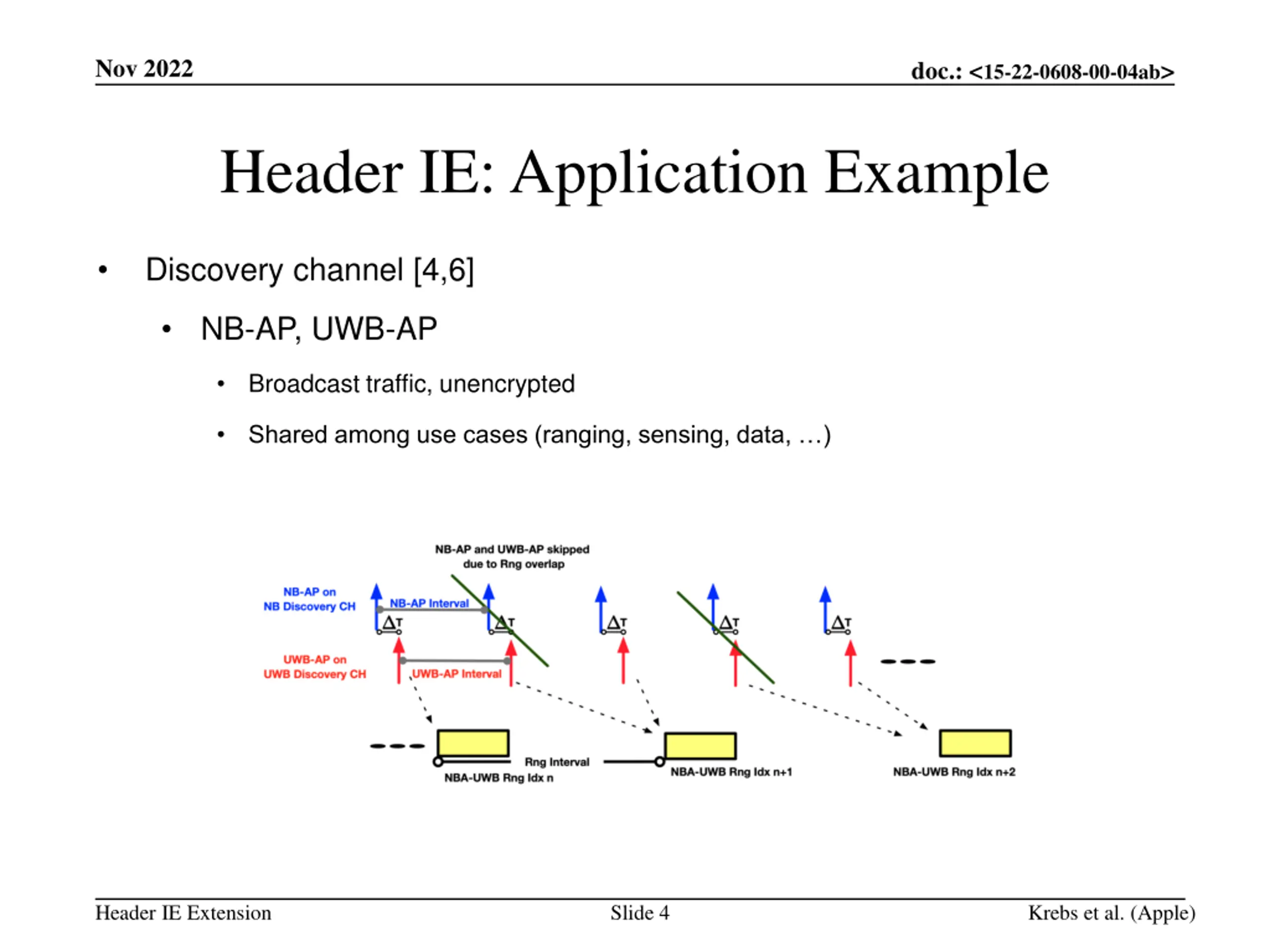 Nov 2022 doc.: <15-22-0608-00-04ab> Header IE: Application Example Discovery channel [4,6] NB-AP, UWB-AP Broadcast traffic, unencrypted Shared among use cases (ranging, sensing, data, ) Header IE Extension Slide 4 Krebs et al. (Apple)