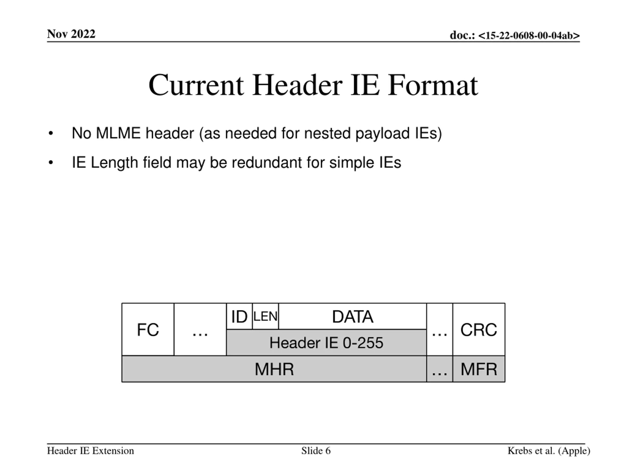 Nov 2022 doc.: <15-22-0608-00-04ab> Current Header IE Format No MLME header (as needed for nested payload IEs) IE Length field may be redundant for simple IEs Header IE Extension Slide 6 Krebs et al. (Apple)