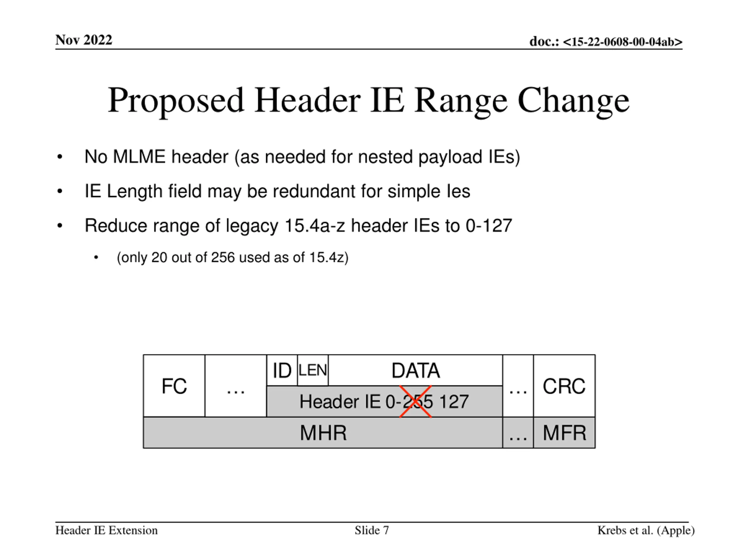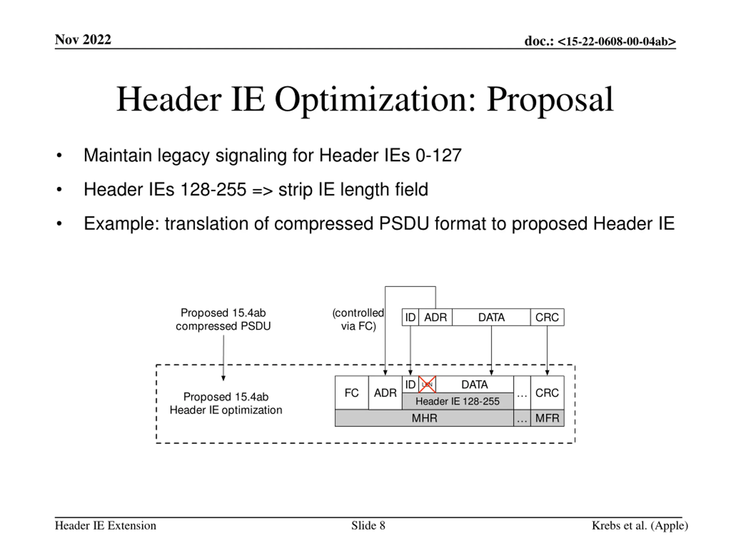Nov 2022 doc.: <15-22-0608-00-04ab> Proposed Header IE Range Change No MLME header (as needed for nested payload IEs) IE Length field may be redundant for simple Ies Reduce range of legacy 15.4a-z header IEs to 0-127 (only 20 out of 256 used as of 15.4z) ID DATA LEN FC CRC Header IE 0-255 127 MHR MFR Header IE Extension Slide 7 Krebs et al. (Apple)