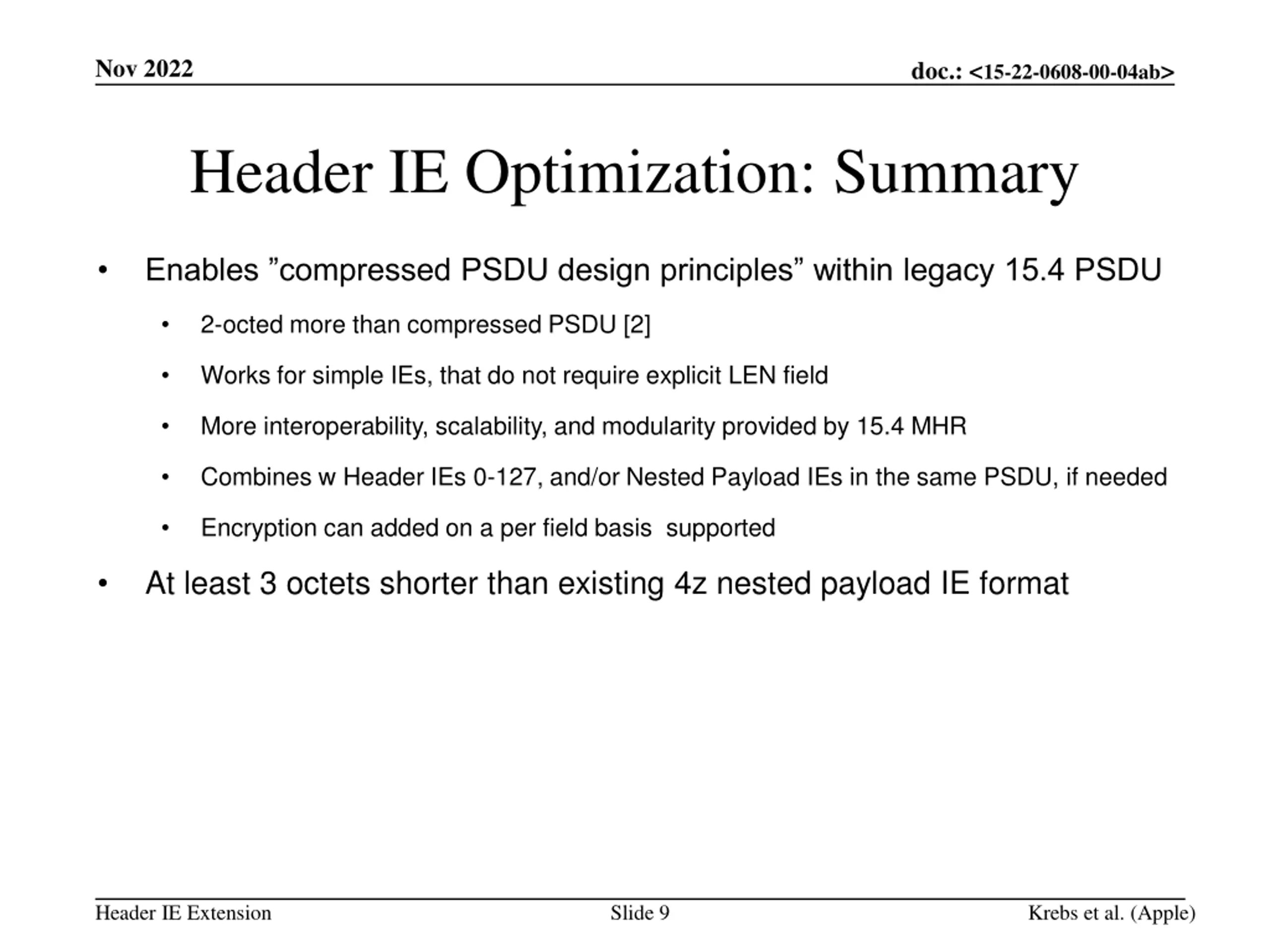 Nov 2022 doc.: <15-22-0608-00-04ab> Header IE Optimization: Proposal Maintain legacy signaling for Header IEs 0-127 Header IEs 128-255 => strip IE length field Example: translation of compressed PSDU format to proposed Header IE Proposed 15.4ab compressed PSDU (controlled via FC) ID ADR DATA CRC ID DATA LEN FC ADR CRC Proposed 15.4ab Header IE optimization Header IE 128-255 MHR MFR Header IE Extension Slide 8 Krebs et al. (Apple)