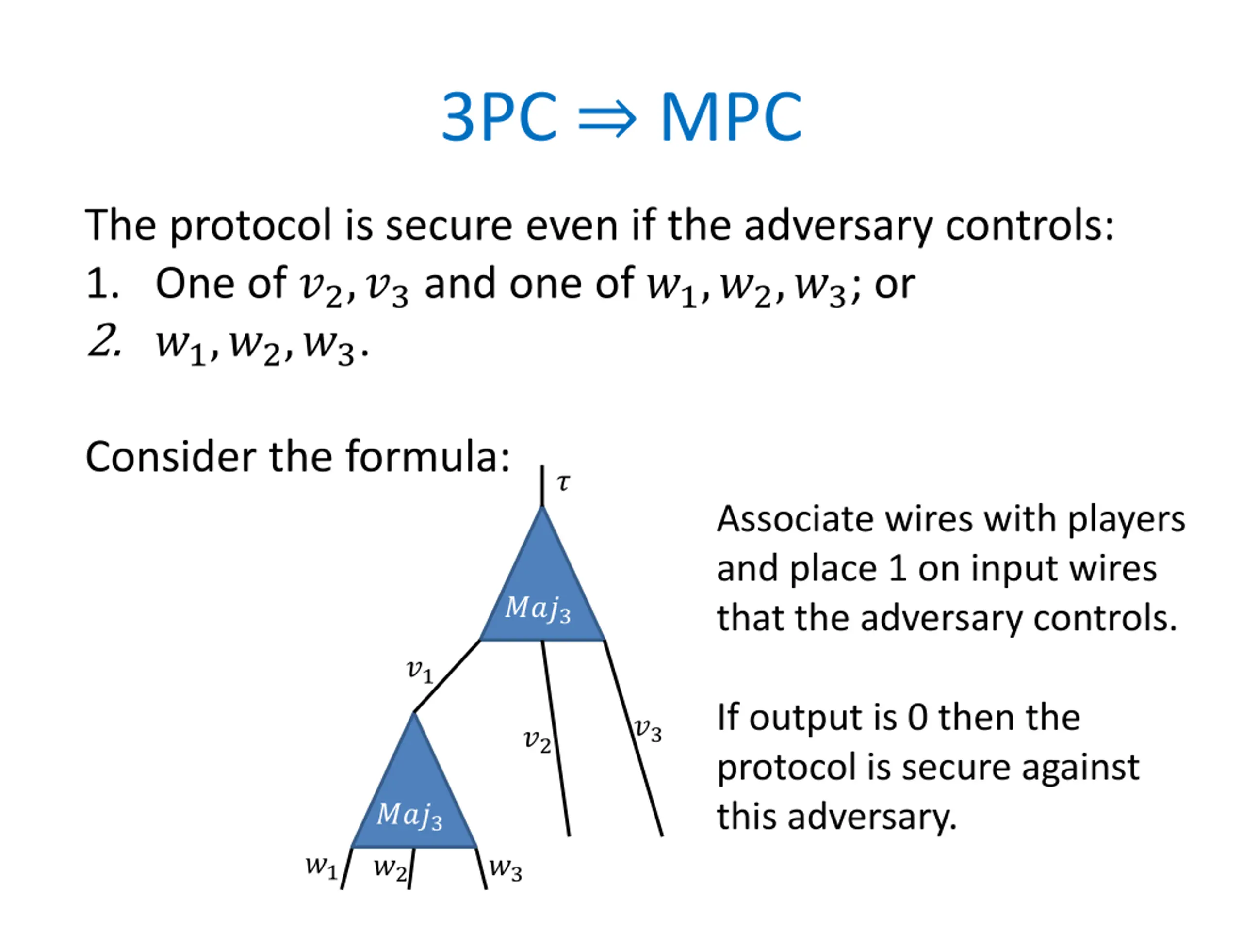 3PC MPC The protocol is secure even if the adversary controls: 1. One of ?2,?3 and one of ?1,?2,?3; or 2. ?1,?2,?3. Consider the formula: ? Associate wires with players and place 1 on input wires that the adversary controls. ???3 ?1 If output is 0 then the protocol is secure against this adversary. ?3 ?2 ???3 ?2 ?1 ?3