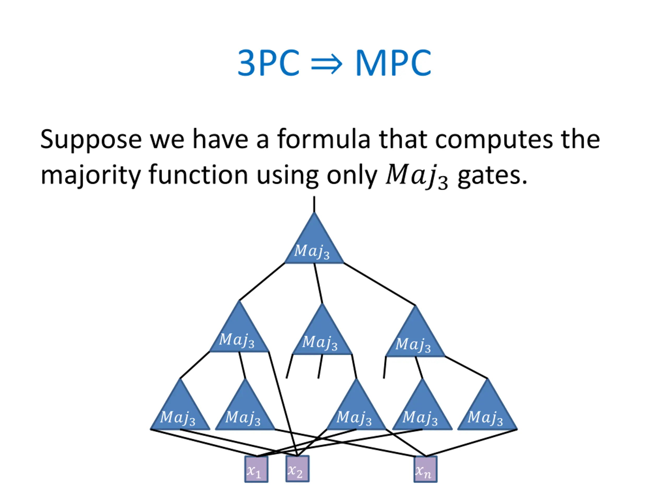 3PC MPC Suppose we have a formula that computes the majority function using only ???3 gates. ???3 ???3 ???3 ???3 ???3 ???3 ???3 ???3 ???3 ?2 ?1 ??