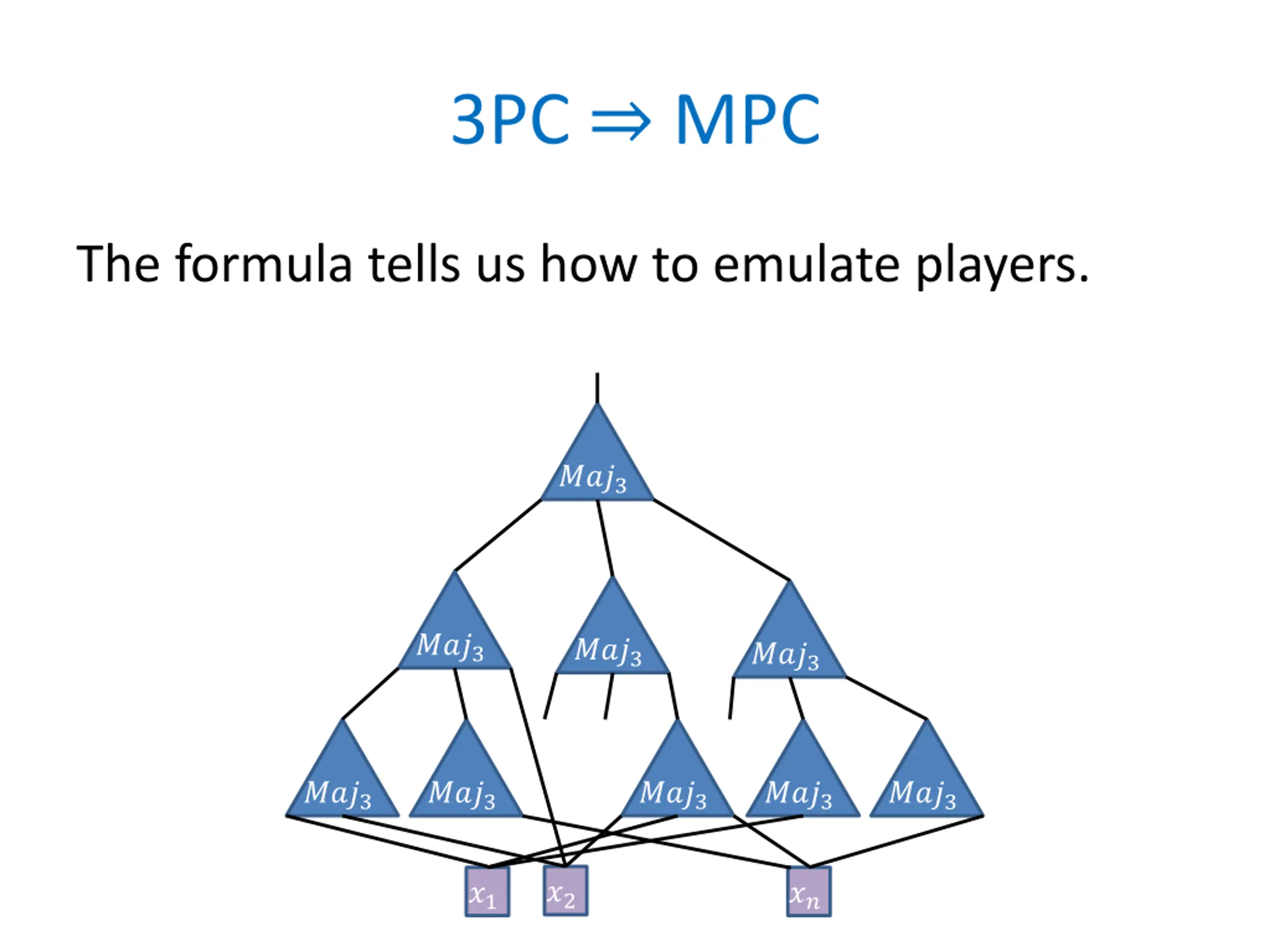 Efficient MPC via Player Emulation Still need two ingredients: 1. A secure 3-party protocol. 2. A logarithmic depth formula that computes majority using only ???3 gates.