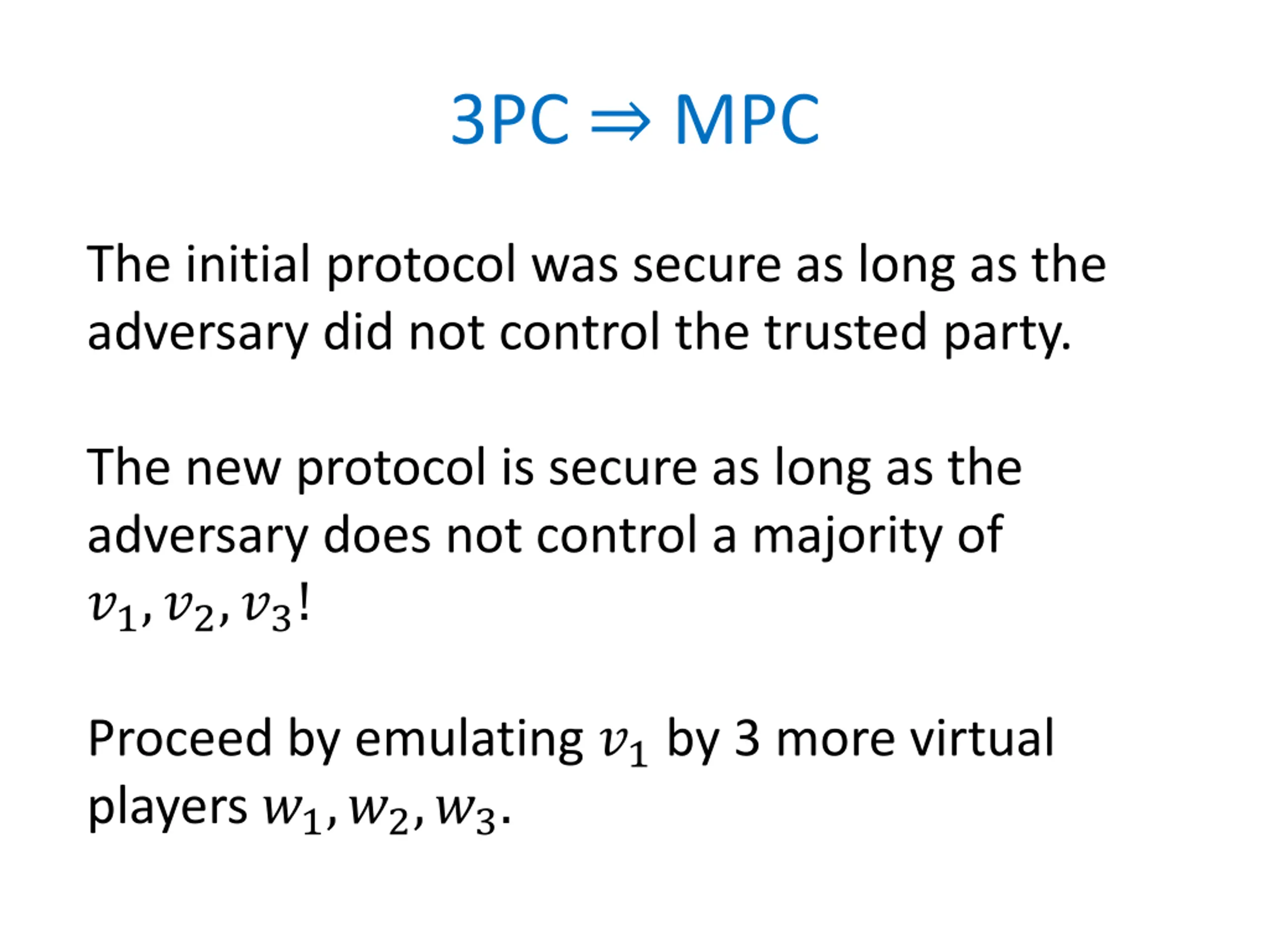MPC via Player Emulation Assume: 3 player MPC with security against 1 passive player. Goal: Construct MPC protocol for ? players (with passive security against ? < ?/2 players).