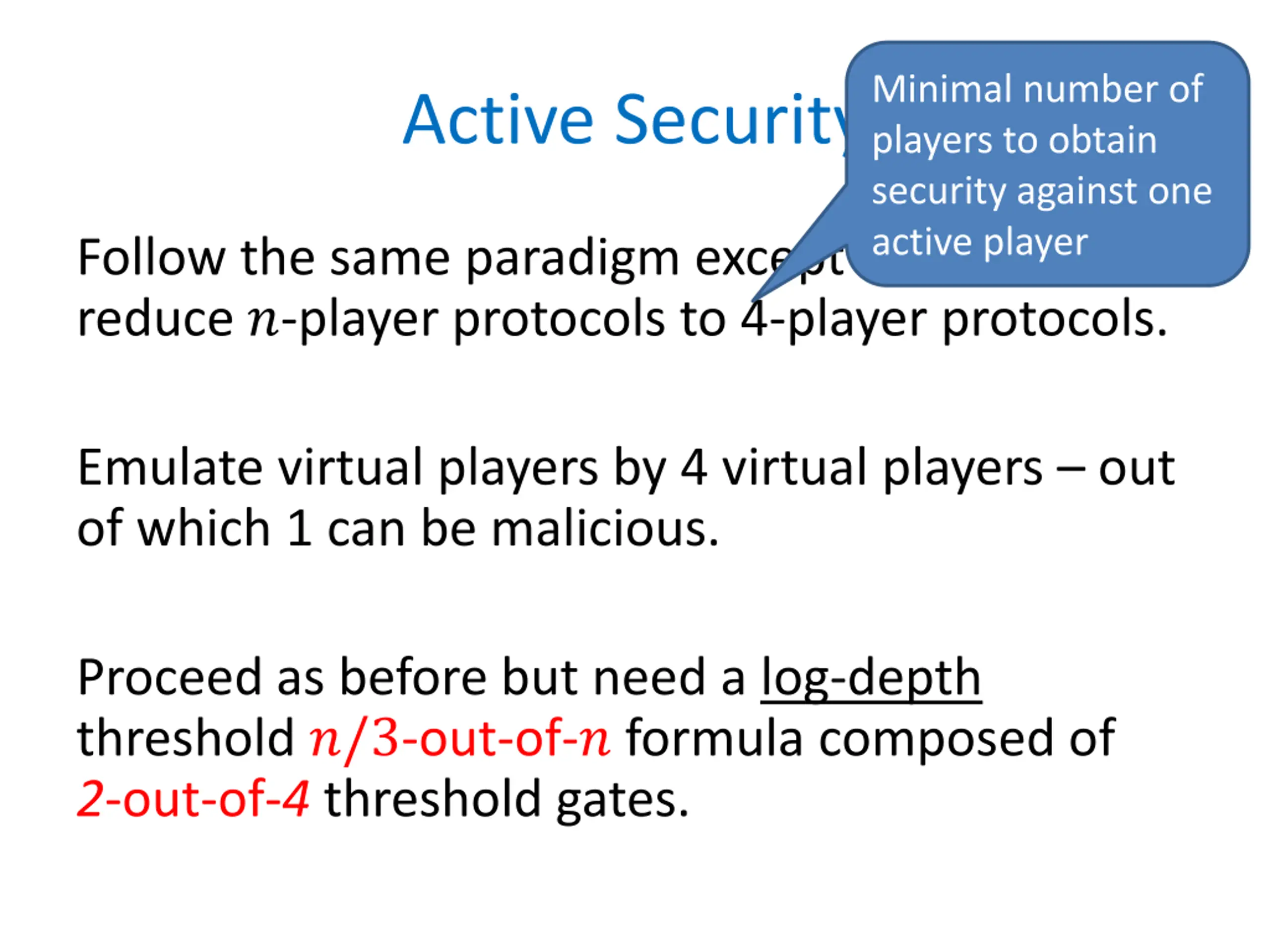 Minimal number of players to obtain security against one active player Active Security Follow the same paradigm except that now we reduce ?-player protocols to 4-player protocols. Emulate virtual players by 4 virtual players out of which 1 can be malicious. Proceed as before but need a log-depth threshold ?/3-out-of-? formula composed of 2-out-of-4 threshold gates.