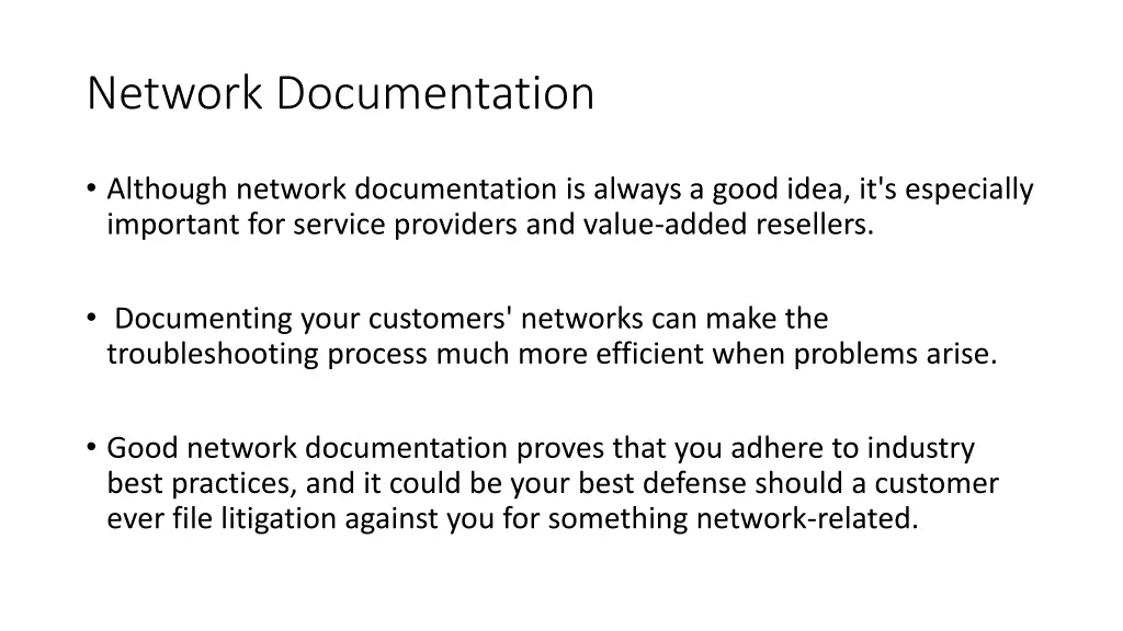 Network Documentation Although network documentation is always a good idea, it's especially important for service providers and value-added resellers. Documenting your customers' networks can make the troubleshooting process much more efficient when problems arise. Good network documentation proves that you adhere to industry best practices, and it could be your best defense should a customer ever file litigation against you for something network-related.