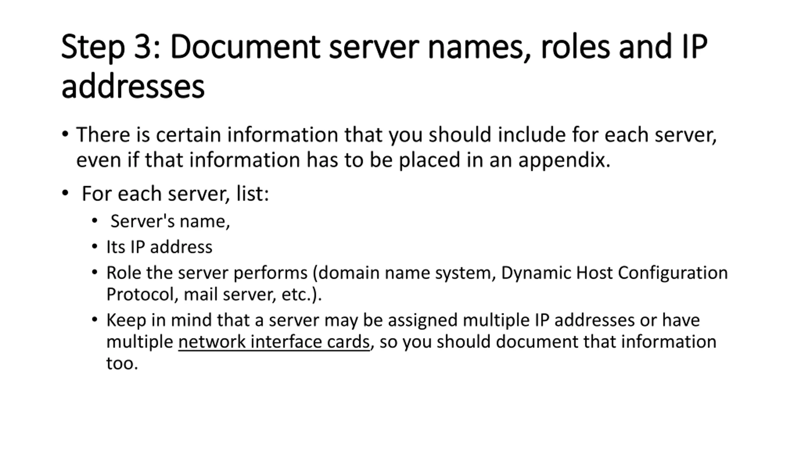 Step 3: Document server names, roles and IP Step 3: Document server names, roles and IP addresses addresses There is certain information that you should include for each server, even if that information has to be placed in an appendix. For each server, list: Server's name, Its IP address Role the server performs (domain name system, Dynamic Host Configuration Protocol, mail server, etc.). Keep in mind that a server may be assigned multiple IP addresses or have multiple network interface cards, so you should document that information too.