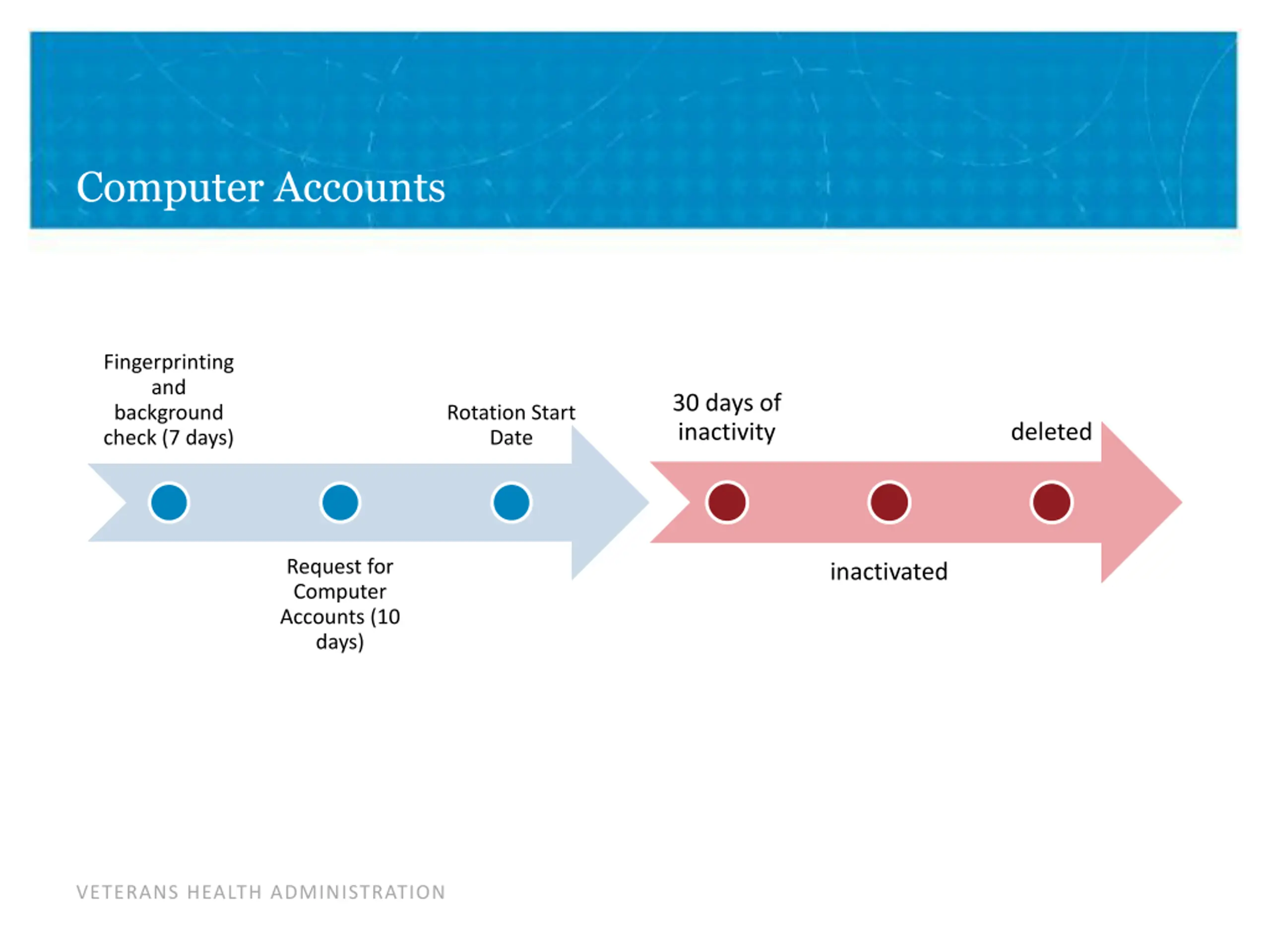 Computer Accounts Fingerprinting and background check (7 days) Rotation Start Date Request for Computer Accounts (10 days) VETERANS HEALTH ADMINISTRATION