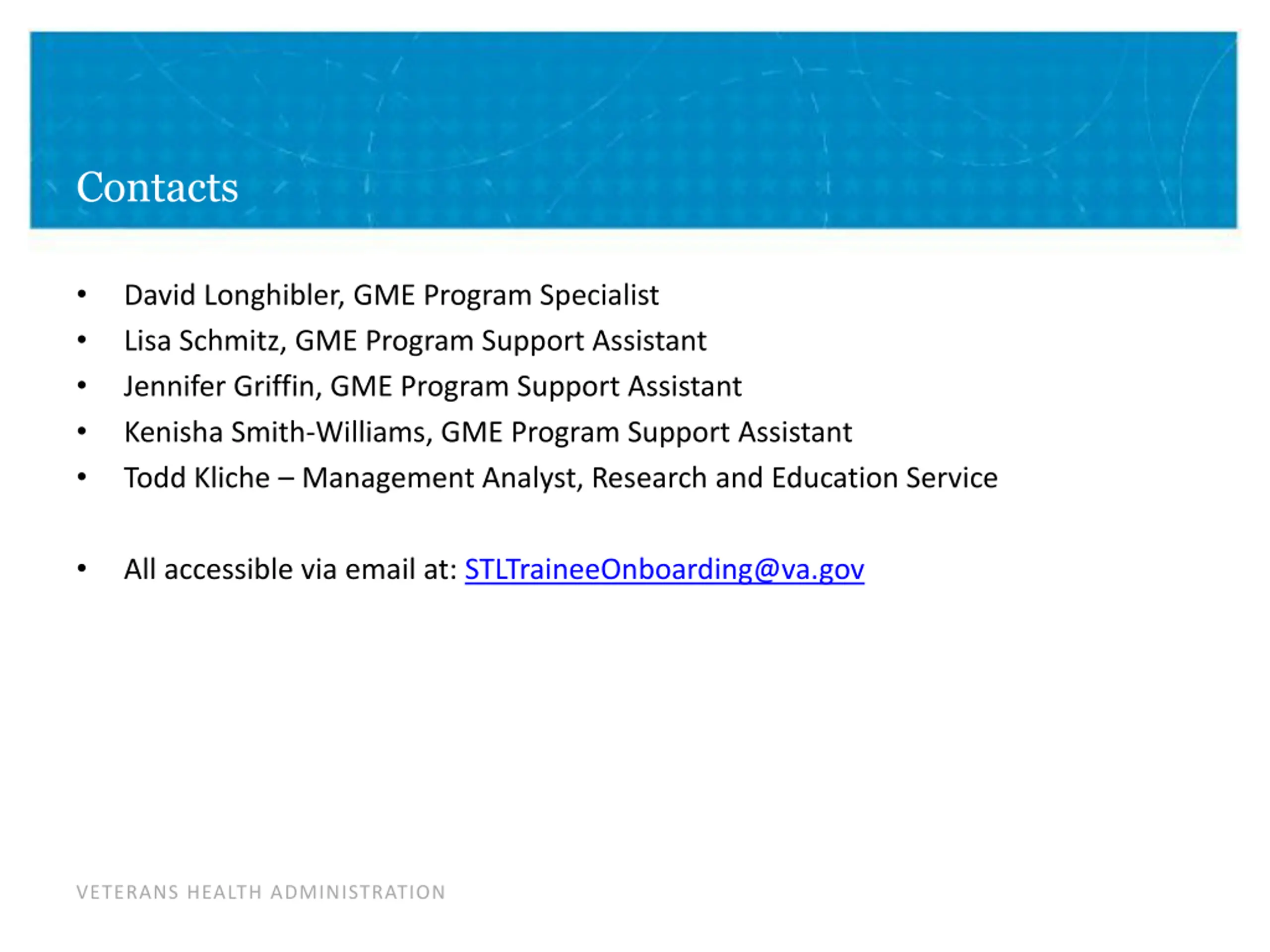 Contacts David Longhibler, GME Program Specialist Lisa Schmitz, GME Program Support Assistant Jennifer Griffin, GME Program Support Assistant Kenisha Smith-Williams, GME Program Support Assistant Todd Kliche Management Analyst, Research and Education Service All accessible via email at: STLTraineeOnboarding@va.gov VETERANS HEALTH ADMINISTRATION