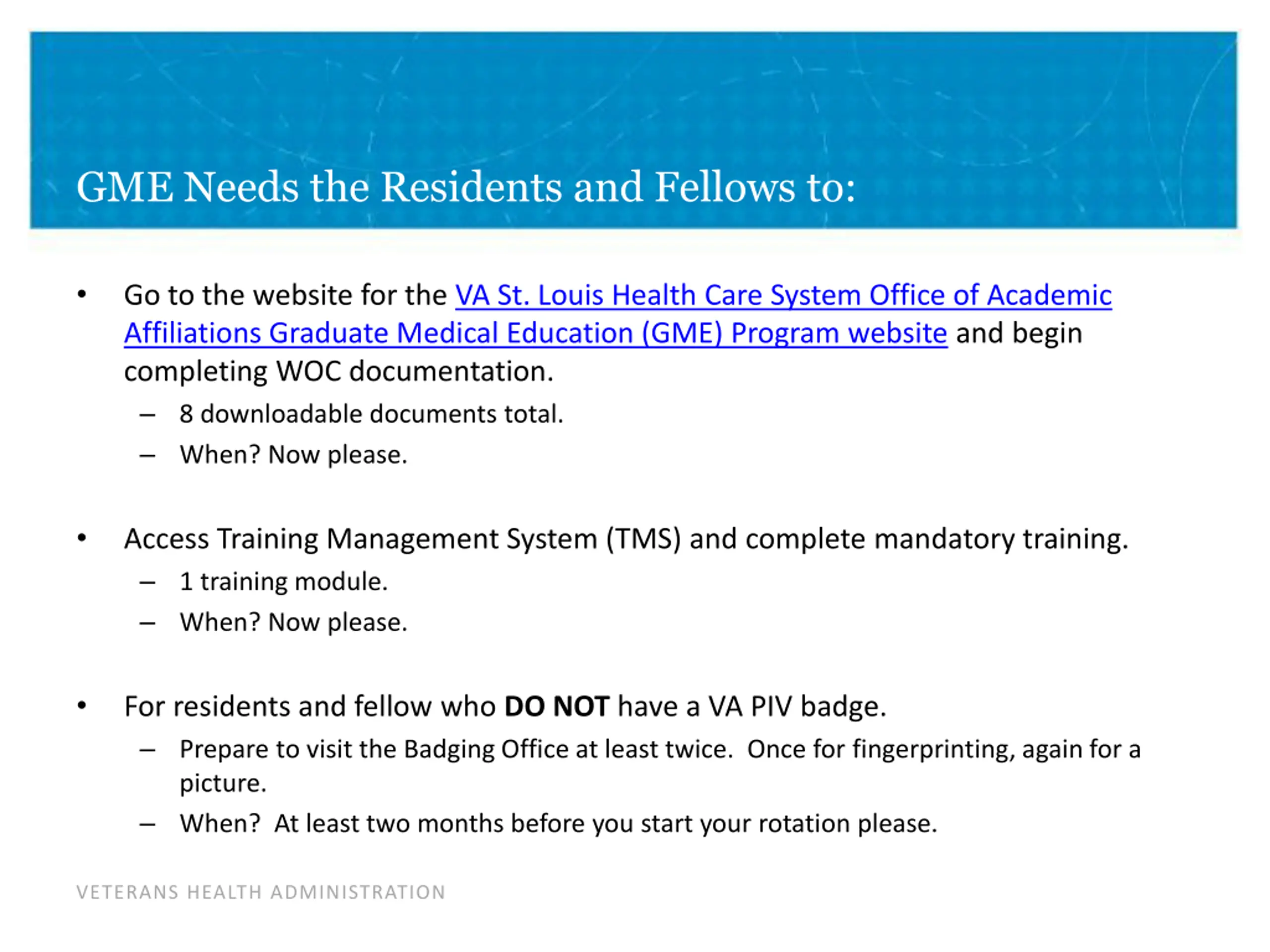 GME Needs the Residents and Fellows to: Go to the website for the VA St. Louis Health Care System Office of Academic Affiliations Graduate Medical Education (GME) Program website and begin completing WOC documentation. 8 downloadable documents total. When? Now please. Access Training Management System (TMS) and complete mandatory training. 1 training module. When? Now please. For residents and fellow who DO NOT have a VA PIV badge. Prepare to visit the Badging Office at least twice. Once for fingerprinting, again for a picture. When? At least two months before you start your rotation please. VETERANS HEALTH ADMINISTRATION