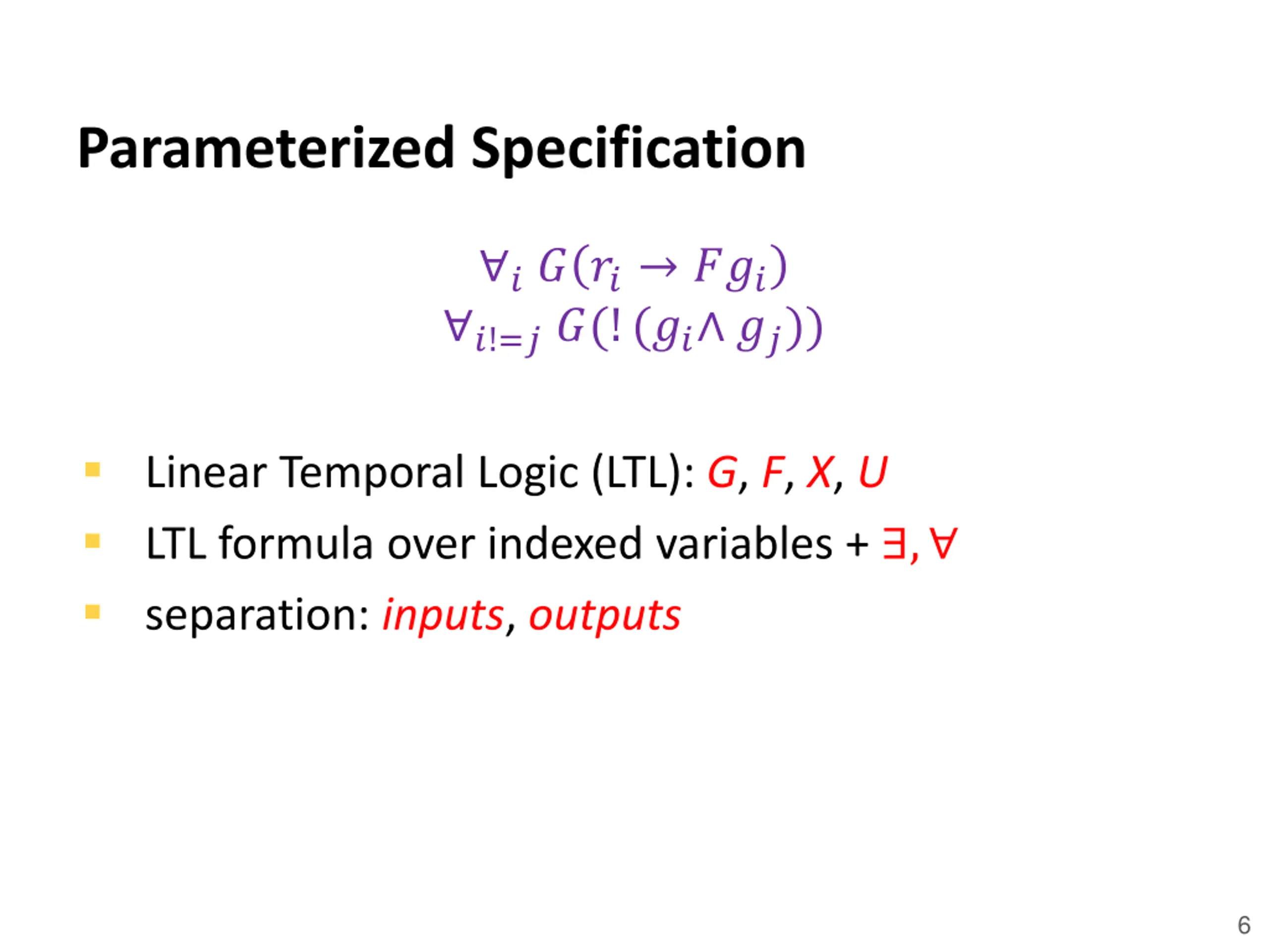Parameterized Specification ?? ?? ??? ?!=??(!(?? ??)) Linear Temporal Logic (LTL): G, F, X, U LTL formula over indexed variables + , separation: inputs, outputs 6