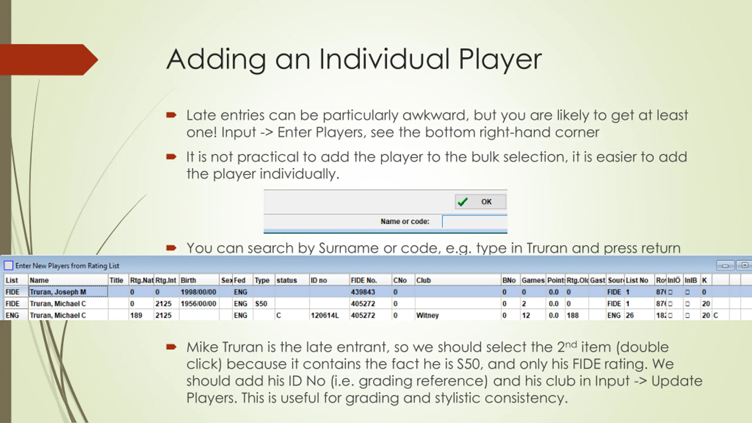 Adding an Individual Player Late entries can be particularly awkward, but you are likely to get at least one! Input -> Enter Players, see the bottom right-hand corner It is not practical to add the player to the bulk selection, it is easier to add the player individually. You can search by Surname or code, e.g. type in Truran and press return Mike Truran is the late entrant, so we should select the 2nditem (double click) because it contains the fact he is S50, and only his FIDE rating. We should add his ID No (i.e. grading reference) and his club in Input -> Update Players. This is useful for grading and stylistic consistency.
