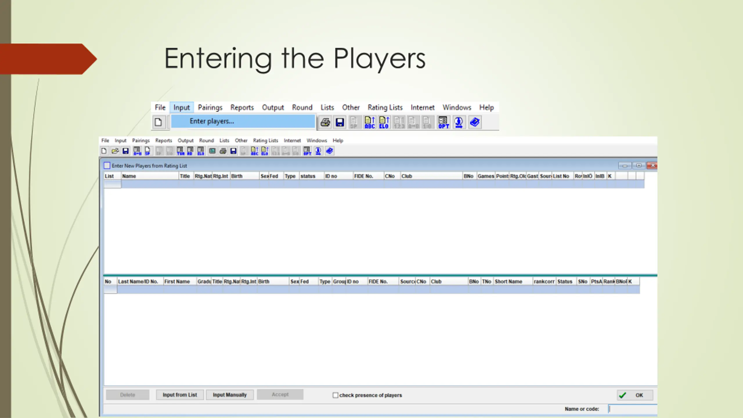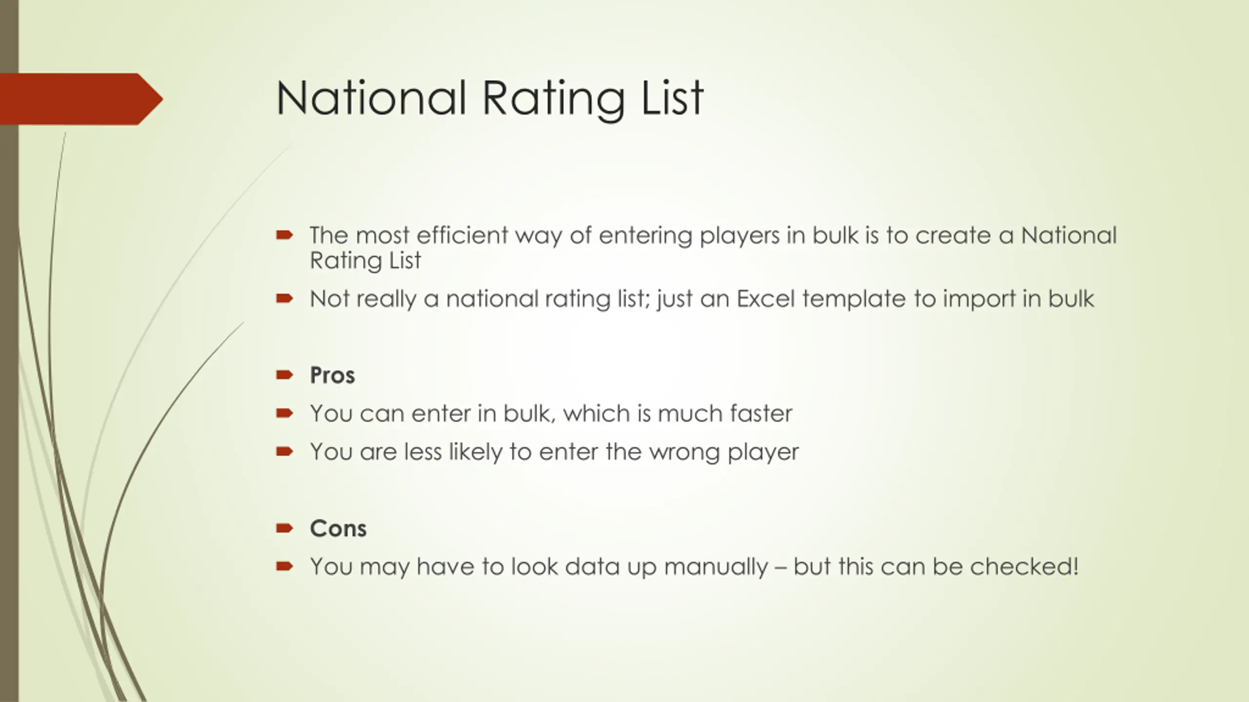 National Rating List The most efficient way of entering players in bulk is to create a National Rating List Not really a national rating list; just an Excel template to import in bulk Pros You can enter in bulk, which is much faster You are less likely to enter the wrong player Cons You may have to look data up manually but this can be checked!