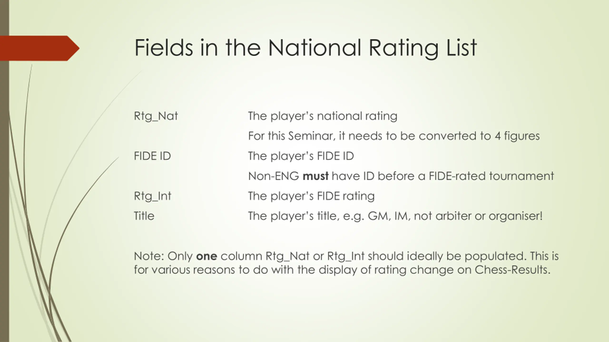 Fields in the National Rating List Rtg_Nat The player s national rating For this Seminar, it needs to be converted to 4 figures FIDE ID The player s FIDE ID Non-ENG must have ID before a FIDE-rated tournament Rtg_Int The player s FIDE rating Title The player s title, e.g. GM, IM, not arbiter or organiser! Note: Only one column Rtg_Nat or Rtg_Int should ideally be populated. This is for various reasons to do with the display of rating change on Chess-Results.