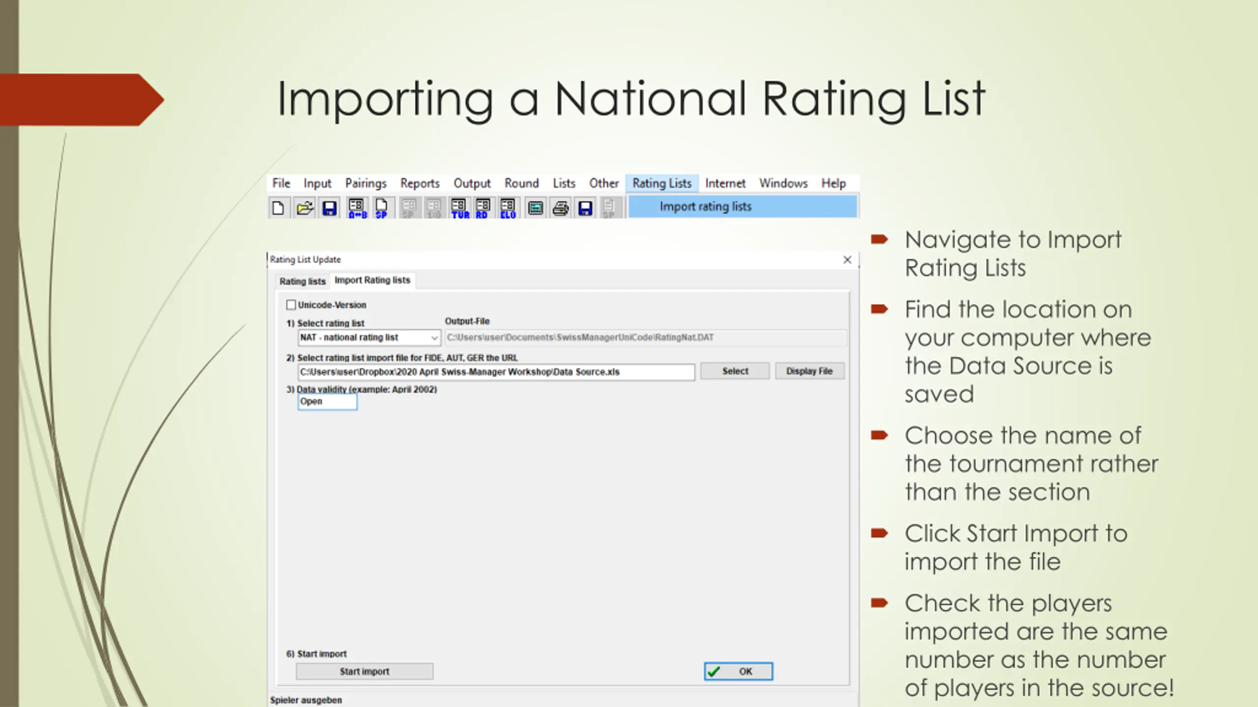 Importing a National Rating List Navigate to Import Rating Lists Find the location on your computer where the Data Source is saved Choose the name of the tournament rather than the section Click Start Import to import the file Check the players imported are the same number as the number of players in the source!