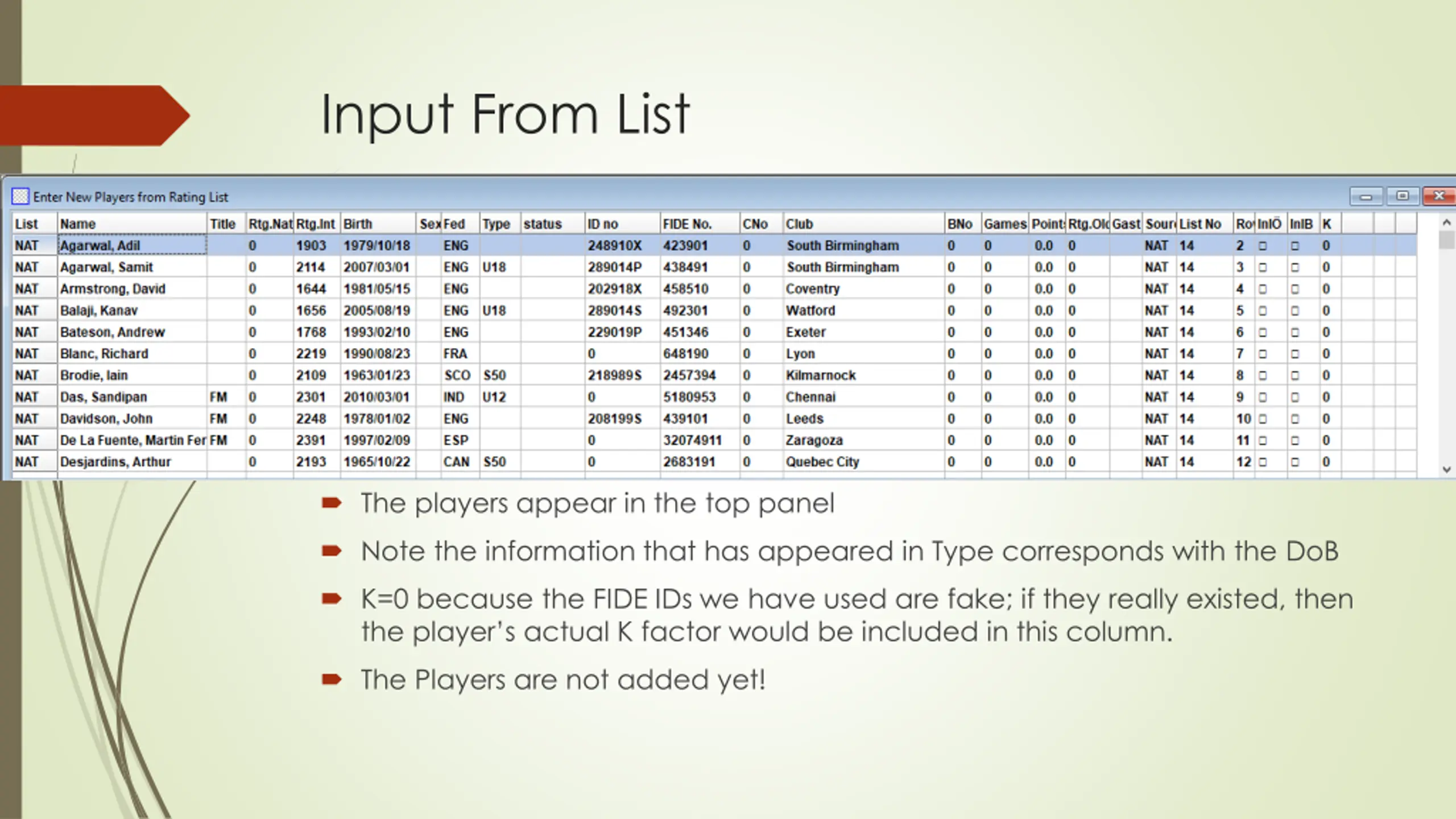 Input From List The players appear in the top panel Note the information that has appeared in Type corresponds with the DoB K=0 because the FIDE IDs we have used are fake; if they really existed, then the player s actual K factor would be included in this column. The Players are not added yet!