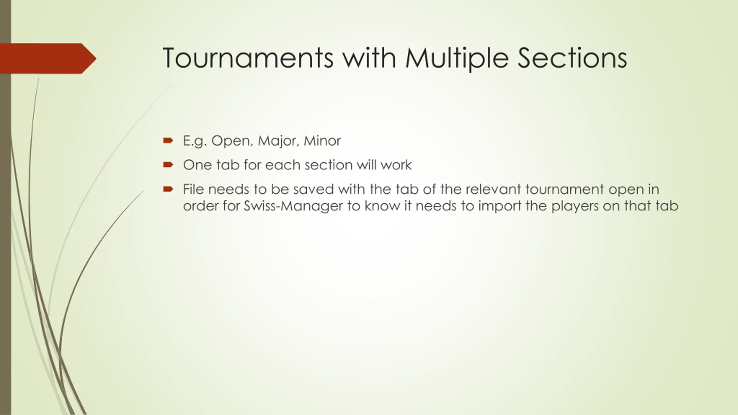 Tournaments with Multiple Sections E.g. Open, Major, Minor One tab for each section will work File needs to be saved with the tab of the relevant tournament open in order for Swiss-Manager to know it needs to import the players on that tab