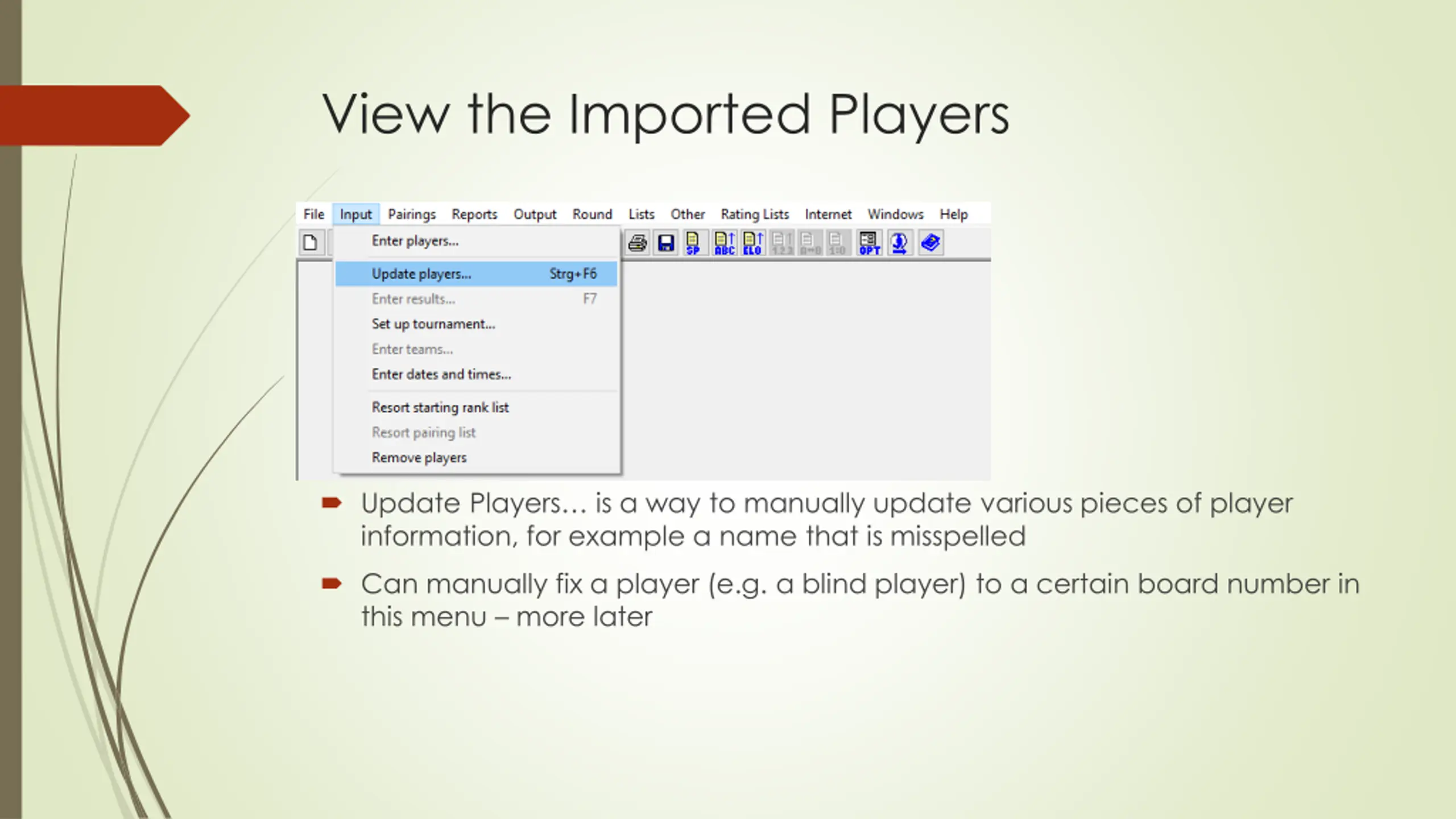 View the Imported Players Update Players is a way to manually update various pieces of player information, for example a name that is misspelled Can manually fix a player (e.g. a blind player) to a certain board number in this menu more later