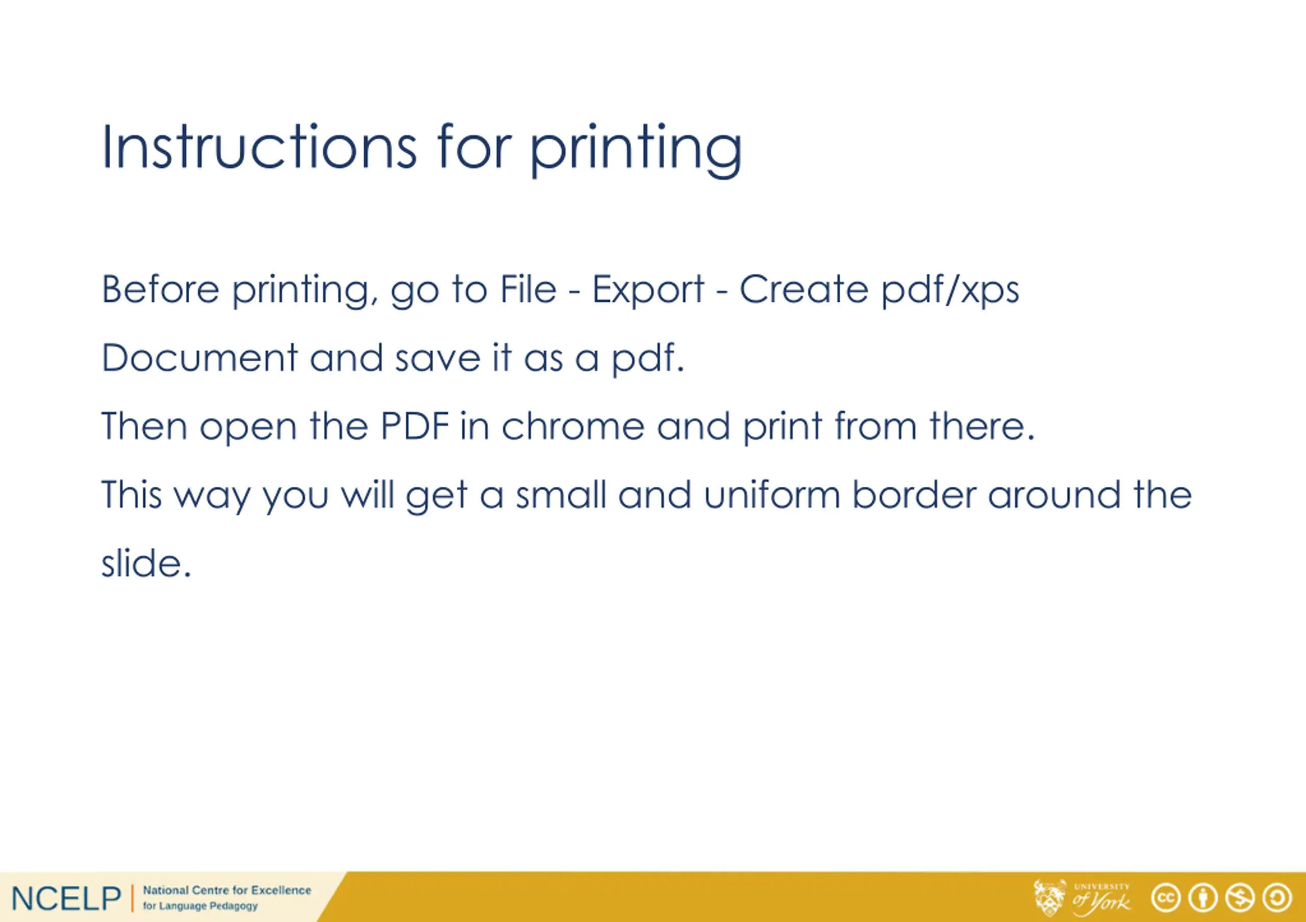 Instructions for printing Before printing, go to File - Export - Create pdf/xps Document and save it as a pdf. Then open the PDF in chrome and print from there. This way you will get a small and uniform border around the slide.