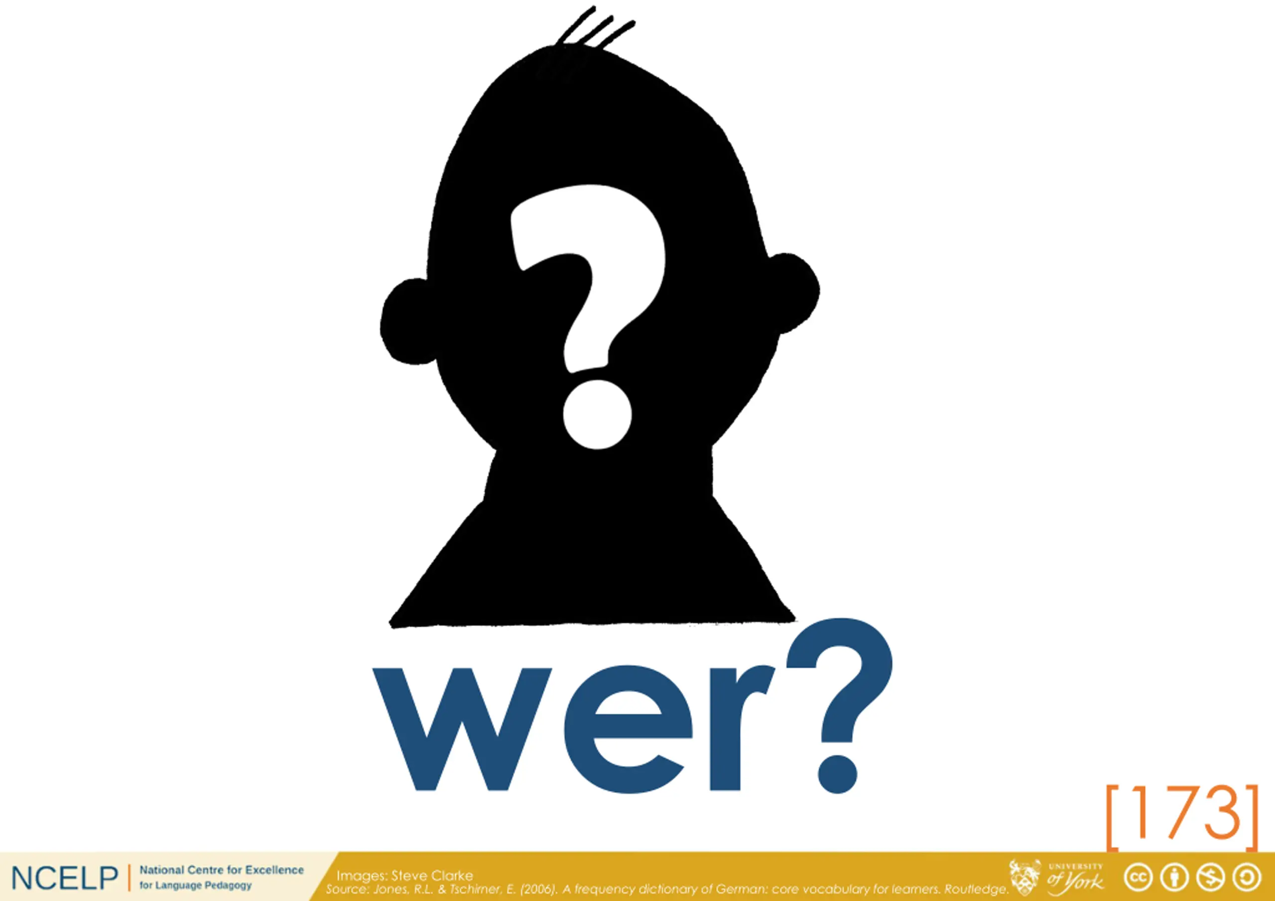 wer? [173] Images: Steve Clarke Source: Jones, R.L. & Tschirner, E. (2006). A frequency dictionary of German: core vocabulary for learners. Routledge.