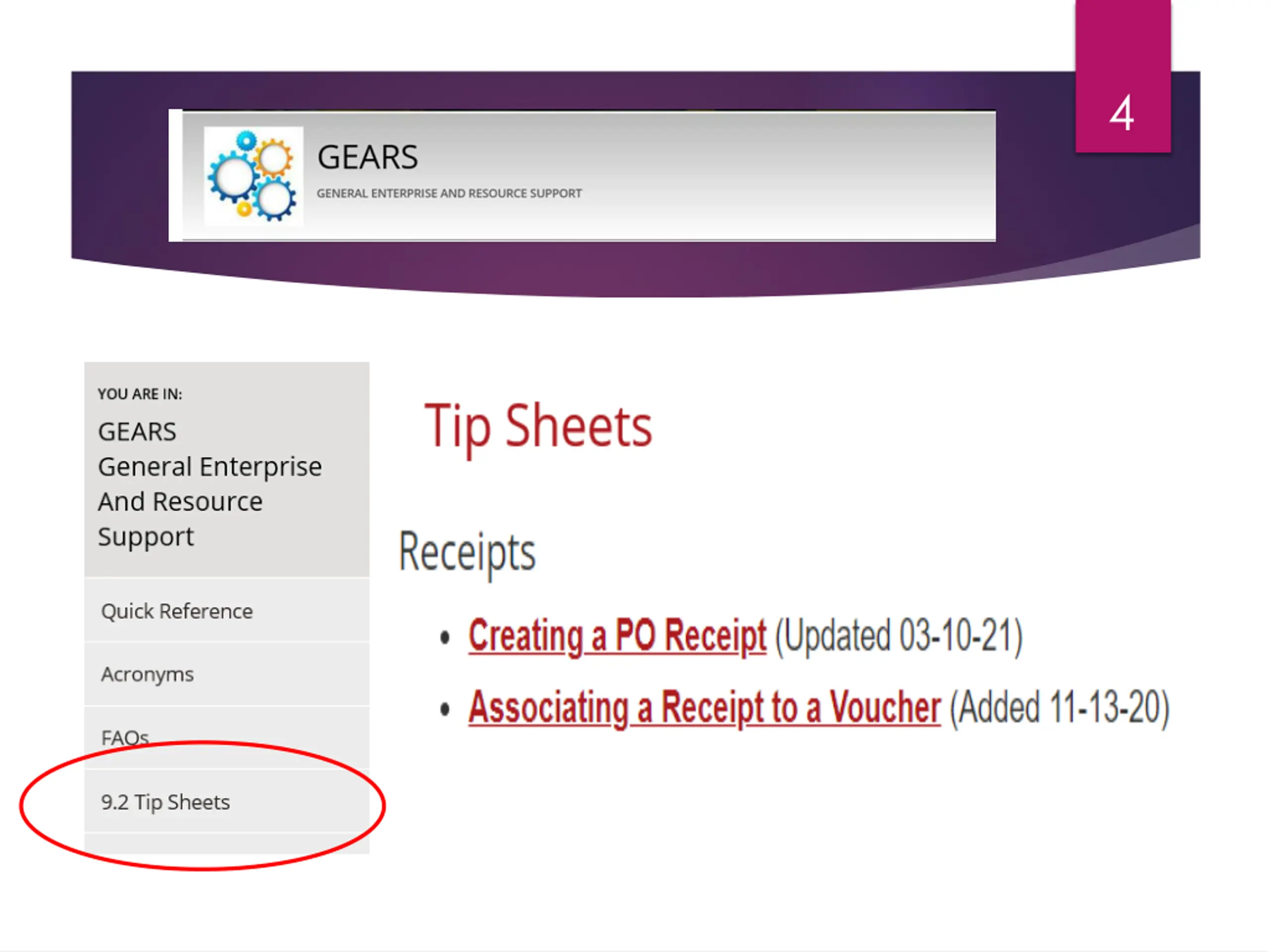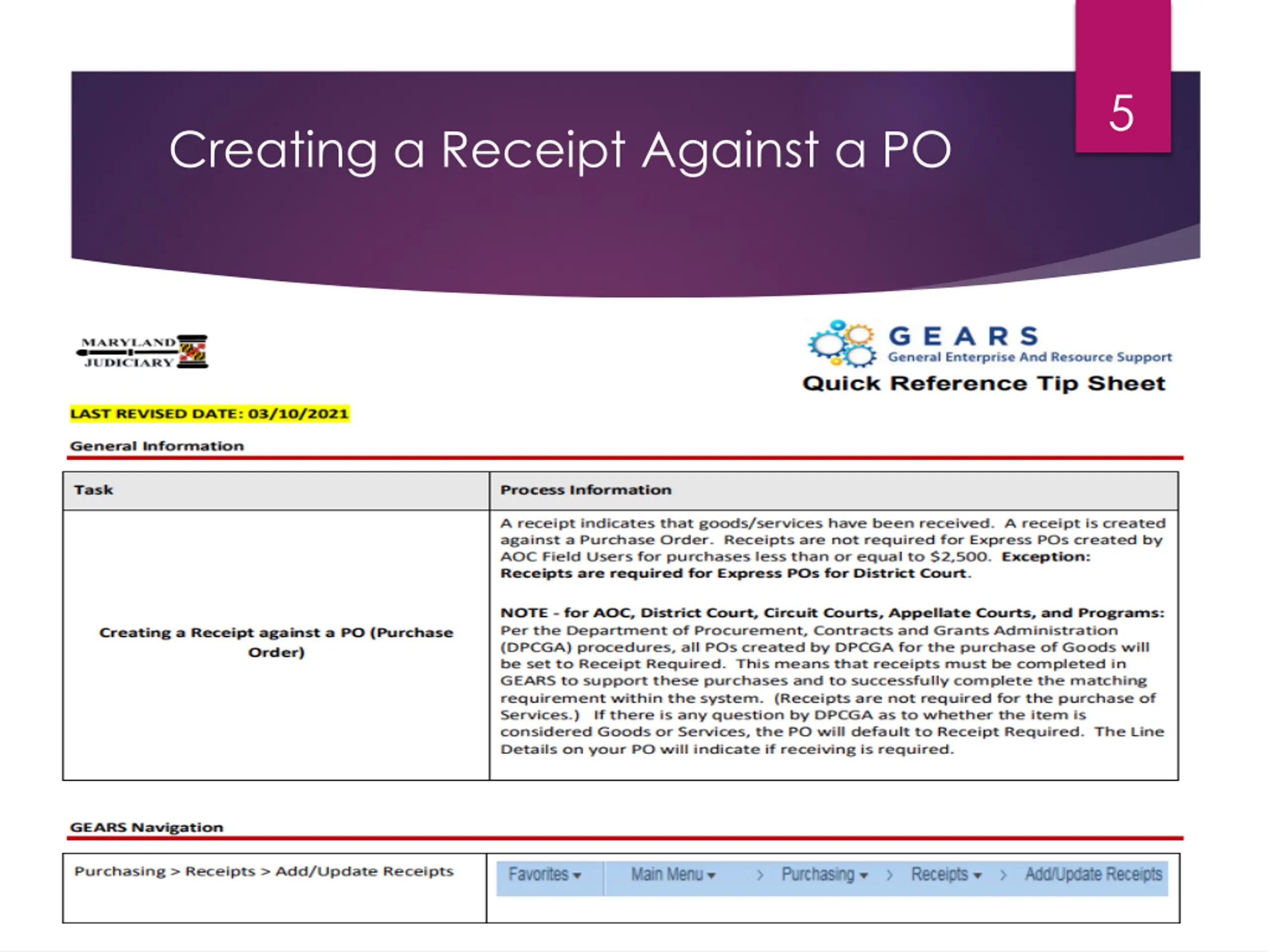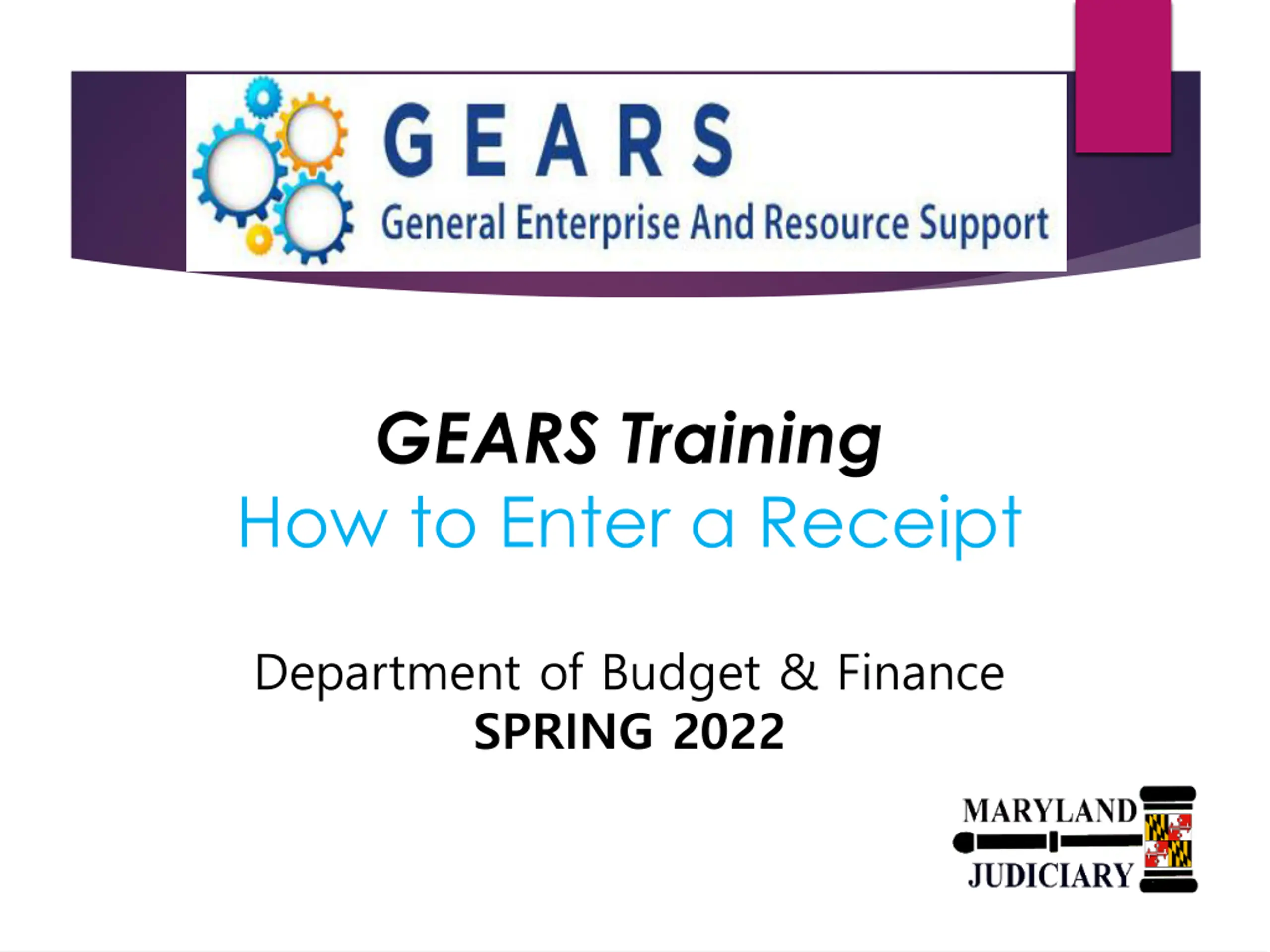 GEARS Training How to Enter a Receipt Department of Budget & Finance SPRING 2022