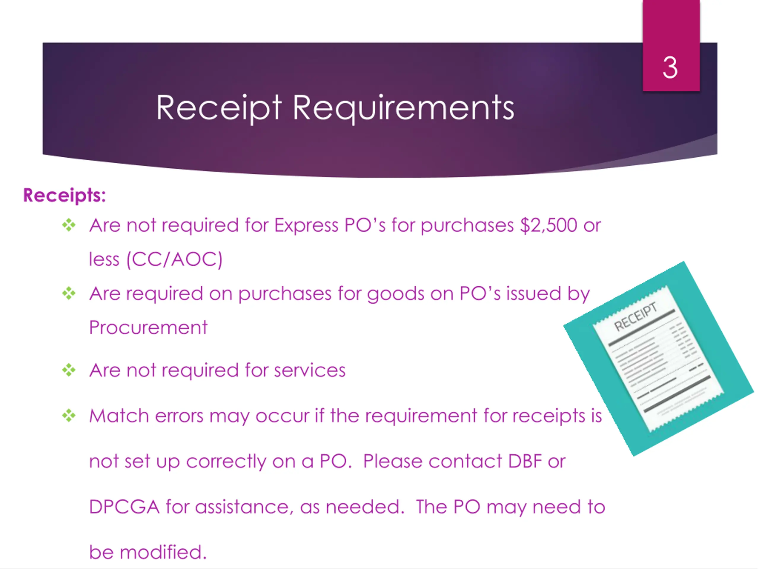 3 Receipt Requirements Receipts: Are not required for Express PO s for purchases $2,500 or less (CC/AOC) Are required on purchases for goods on PO s issued by Procurement Are not required for services Match errors may occur if the requirement for receipts is not set up correctly on a PO. Please contact DBF or DPCGA for assistance, as needed. The PO may need to be modified.
