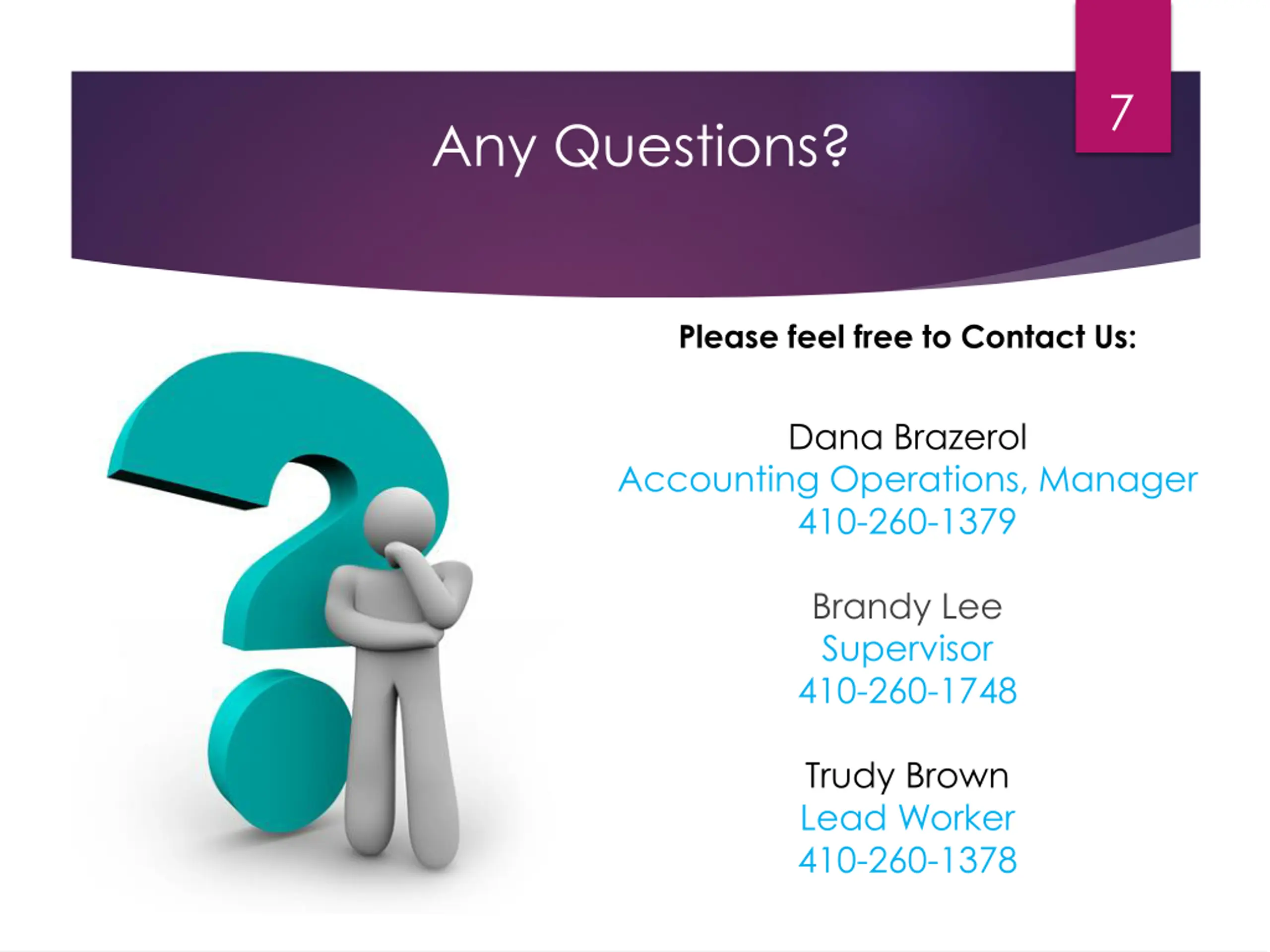 7 Any Questions? Please feel free to Contact Us: Dana Brazerol Accounting Operations, Manager 410-260-1379 Brandy Lee Supervisor 410-260-1748 Trudy Brown Lead Worker 410-260-1378