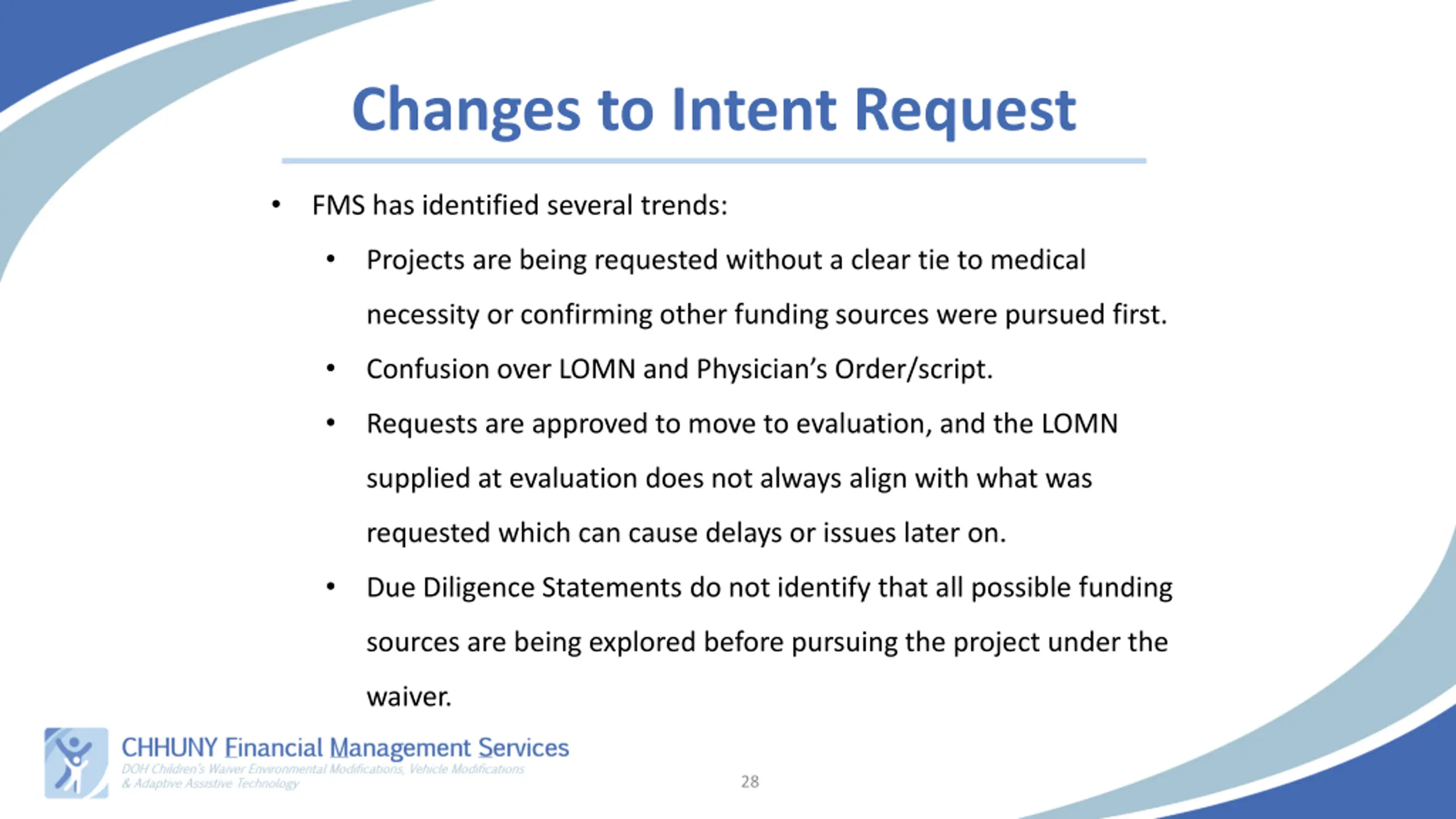 Changes to Intent Request November 1st, 2024 Beginning on 11/1/24, intent requests will now require the following to be submitted with the intent to support the need to move to evaluation/next steps: Letter of Medical Necessity (LOMN) for EMODs/VMODs Clinical Justification for AAT Due Diligence Statement for EMOD/VMOD/AAT Moving forward, the physician s order/script is not needed in addition to an LOMN as it is duplicative. The LOMN must be signed by an MD. Historically, this information was not requested until the pre-project evaluation phase. Why the change? 27