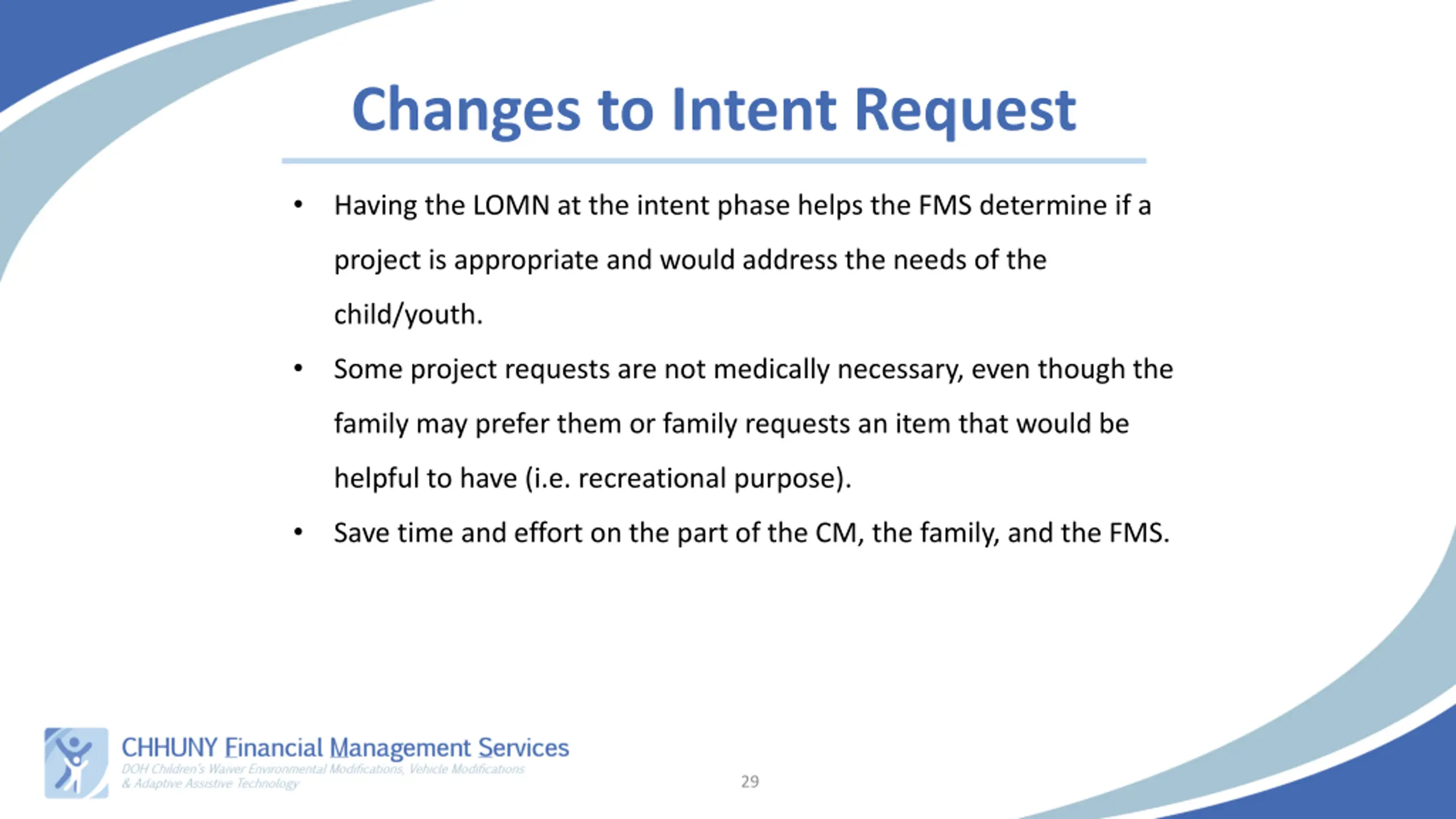 Changes to Intent Request FMS has identified several trends: Projects are being requested without a clear tie to medical necessity or confirming other funding sources were pursued first. Confusion over LOMN and Physician s Order/script. Requests are approved to move to evaluation, and the LOMN supplied at evaluation does not always align with what was requested which can cause delays or issues later on. Due Diligence Statements do not identify that all possible funding sources are being explored before pursuing the project under the waiver. 28