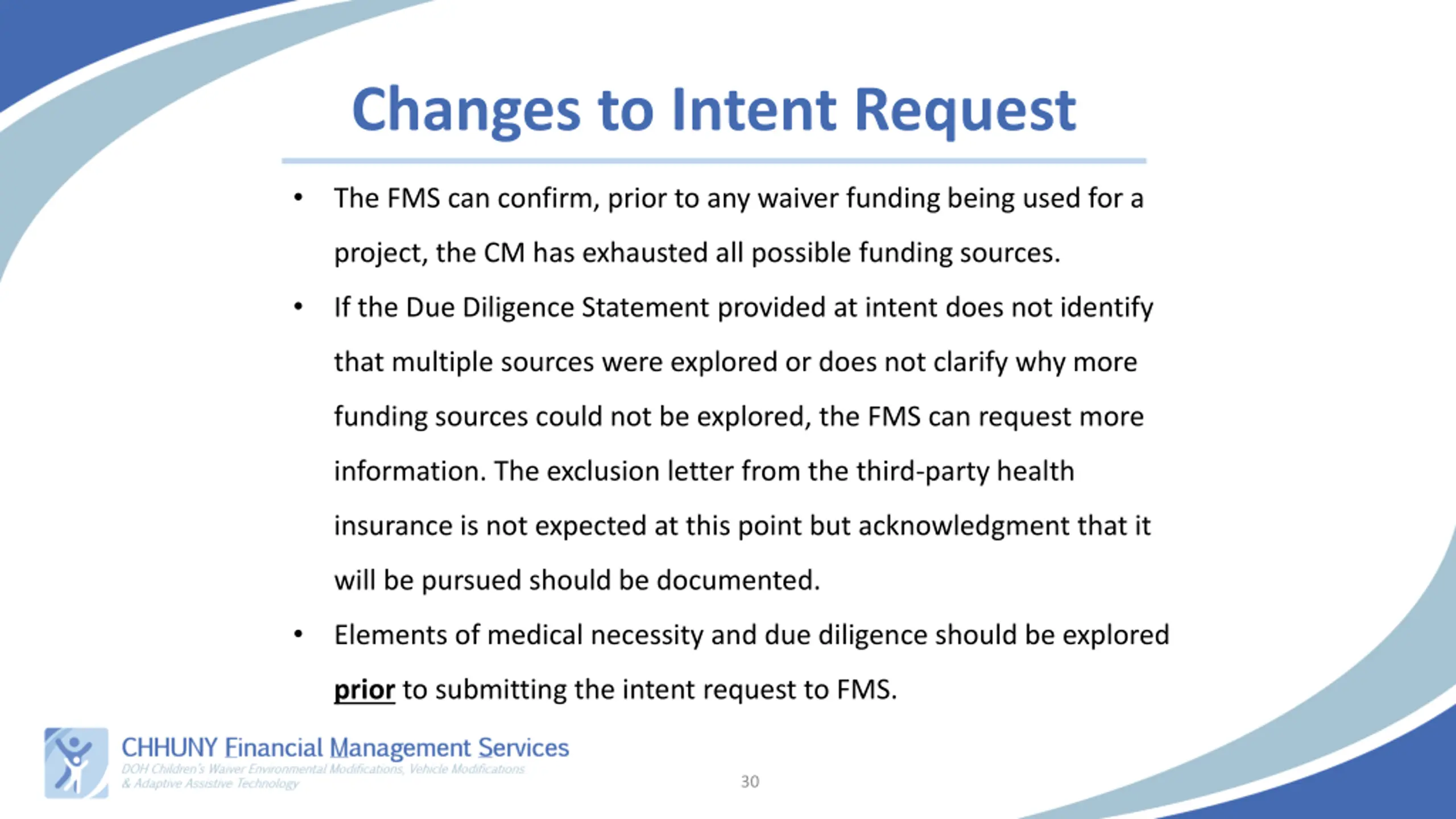 Changes to Intent Request The FMS can confirm, prior to any waiver funding being used for a project, the CM has exhausted all possible funding sources. If the Due Diligence Statement provided at intent does not identify that multiple sources were explored or does not clarify why more funding sources could not be explored, the FMS can request more information. The exclusion letter from the third-party health insurance is not expected at this point but acknowledgment that it will be pursued should be documented. Elements of medical necessity and due diligence should be explored prior to submitting the intent request to FMS. 30