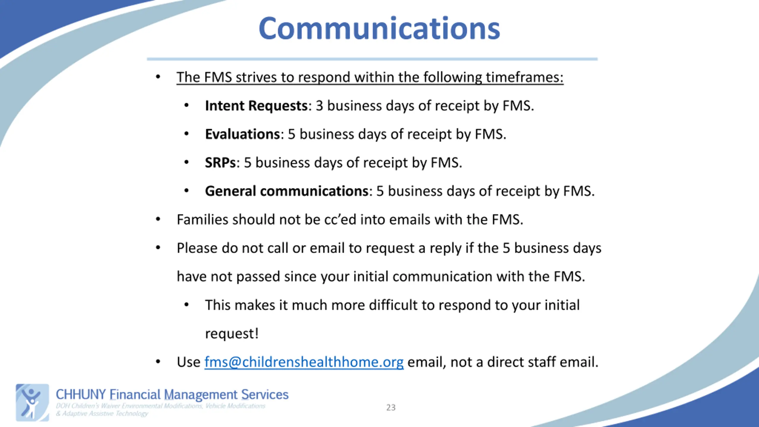 Communications The FMS strives to respond within the following timeframes: Intent Requests: 3 business days of receipt by FMS. Evaluations: 5 business days of receipt by FMS. SRPs: 5 business days of receipt by FMS. General communications: 5 business days of receipt by FMS. Families should not be cc ed into emails with the FMS. Please do not call or email to request a reply if the 5 business days have not passed since your initial communication with the FMS. This makes it much more difficult to respond to your initial request! Use fms@childrenshealthhome.org email, not a direct staff email. 23