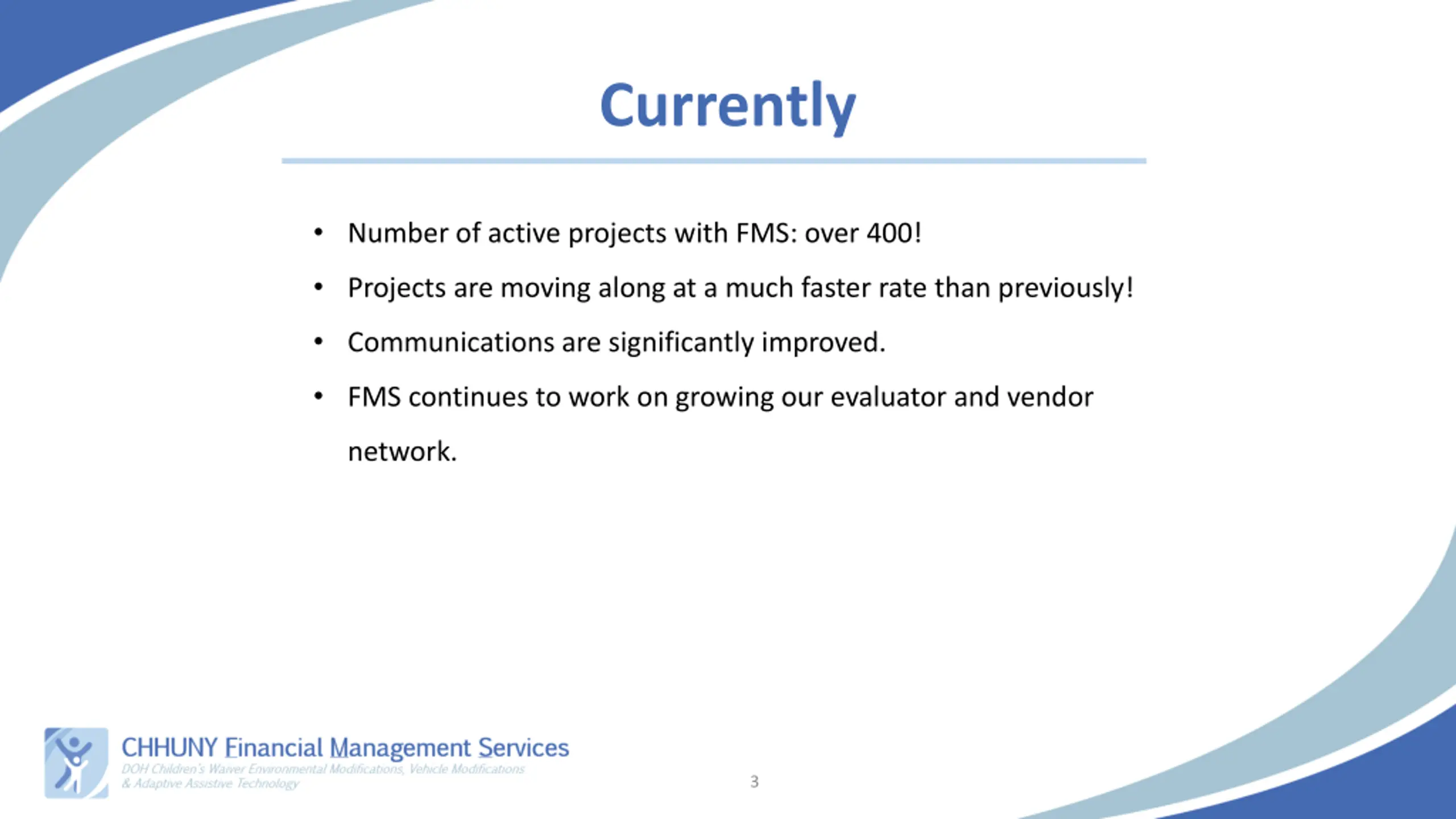 Currently Number of active projects with FMS: over 400! Projects are moving along at a much faster rate than previously! Communications are significantly improved. FMS continues to work on growing our evaluator and vendor network. 3