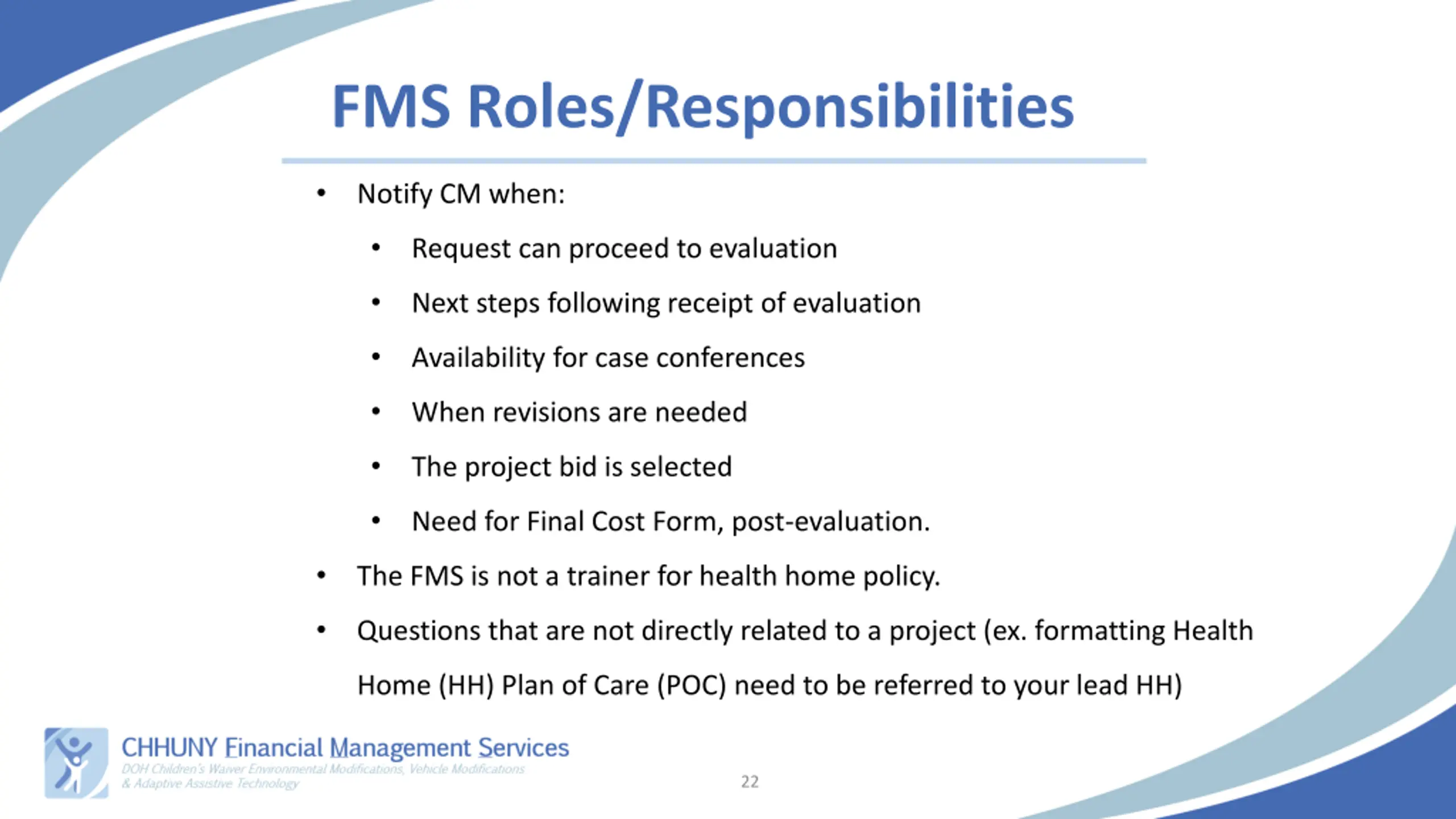 FMS Roles/Responsibilities Notify CM when: Request can proceed to evaluation Next steps following receipt of evaluation Availability for case conferences When revisions are needed The project bid is selected Need for Final Cost Form, post-evaluation. The FMS is not a trainer for health home policy. Questions that are not directly related to a project (ex. formatting Health Home (HH) Plan of Care (POC) need to be referred to your lead HH) 22
