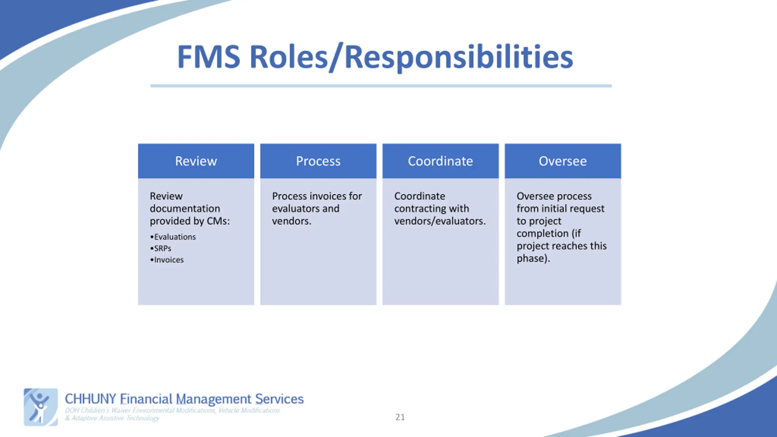 FMS Roles/Responsibilities Review Process Coordinate Oversee Review documentation provided by CMs: Process invoices for evaluators and vendors. Coordinate contracting with vendors/evaluators. Oversee process from initial request to project completion (if project reaches this phase). Evaluations SRPs Invoices 21