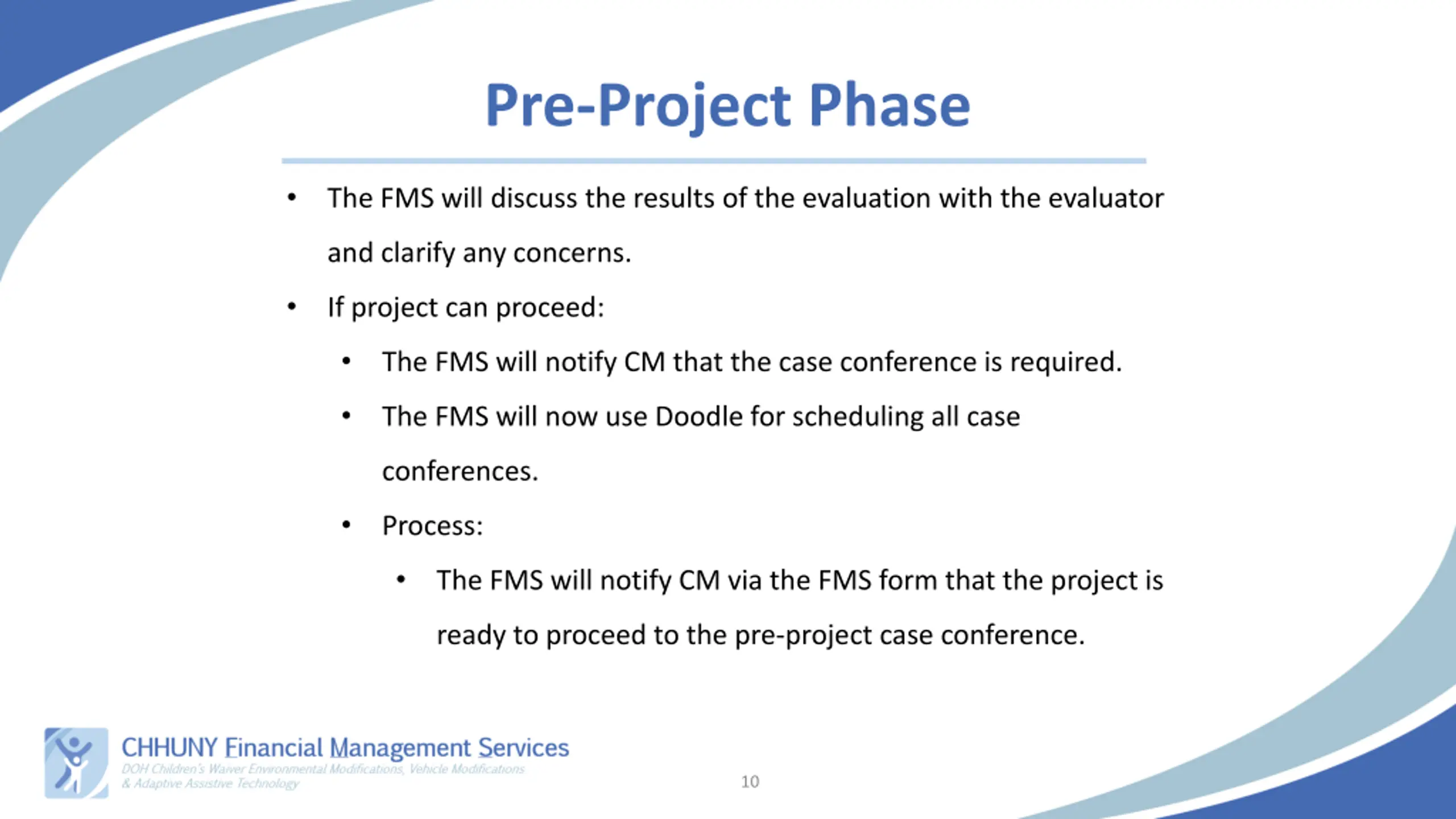 Pre-Project Phase The FMS will discuss the results of the evaluation with the evaluator and clarify any concerns. If project can proceed: The FMS will notify CM that the case conference is required. The FMS will now use Doodle for scheduling all case conferences. Process: The FMS will notify CM via the FMS form that the project is ready to proceed to the pre-project case conference. 10