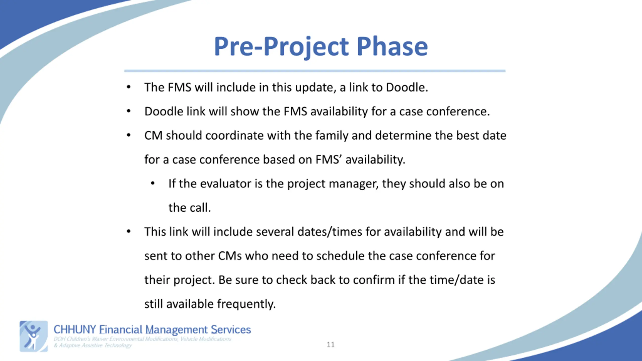 Pre-Project Phase The FMS will include in this update, a link to Doodle. Doodle link will show the FMS availability for a case conference. CM should coordinate with the family and determine the best date for a case conference based on FMS availability. If the evaluator is the project manager, they should also be on the call. This link will include several dates/times for availability and will be sent to other CMs who need to schedule the case conference for their project. Be sure to check back to confirm if the time/date is still available frequently. 11