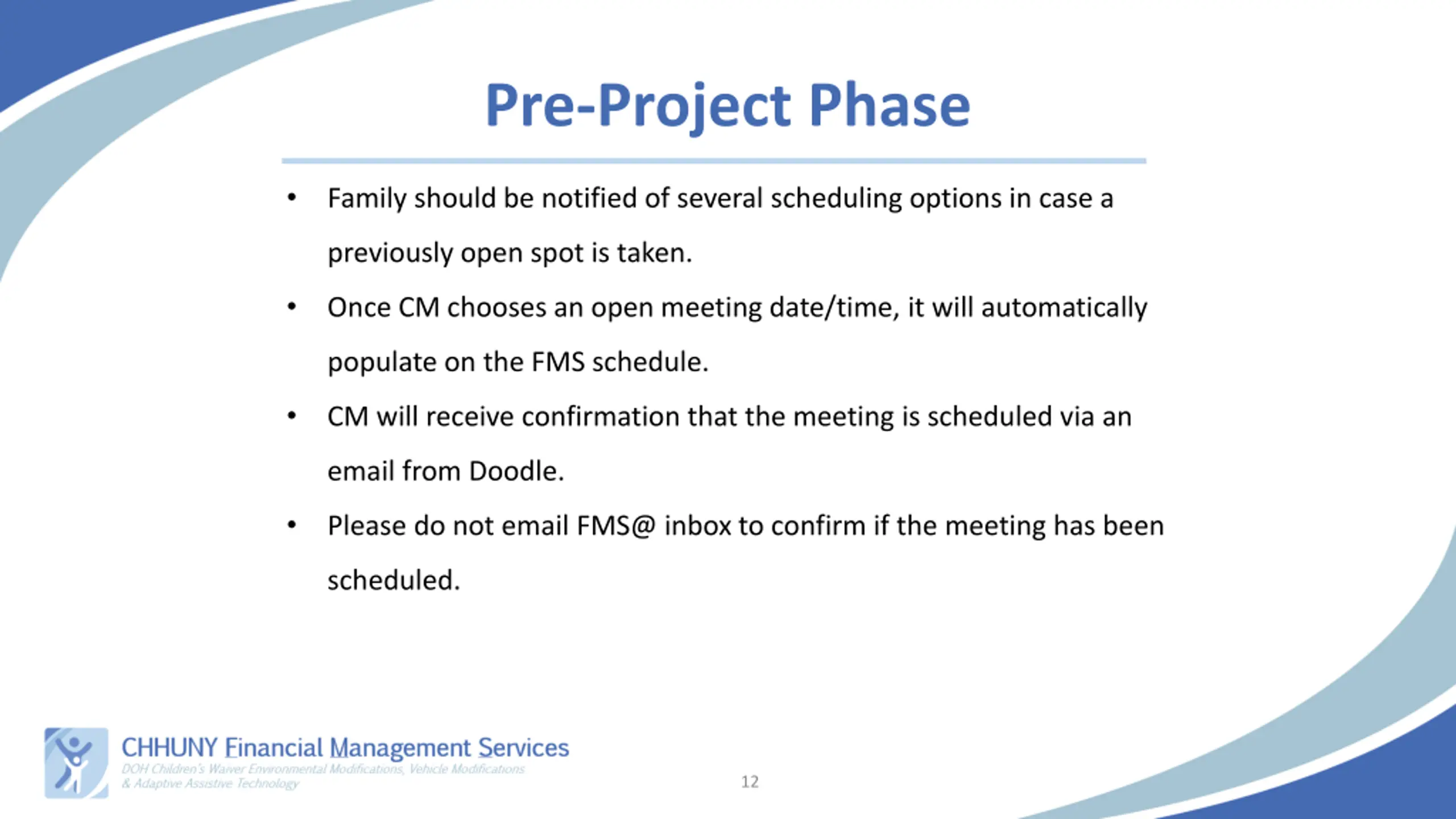 Pre-Project Phase Family should be notified of several scheduling options in case a previously open spot is taken. Once CM chooses an open meeting date/time, it will automatically populate on the FMS schedule. CM will receive confirmation that the meeting is scheduled via an email from Doodle. Please do not email FMS@ inbox to confirm if the meeting has been scheduled. 12