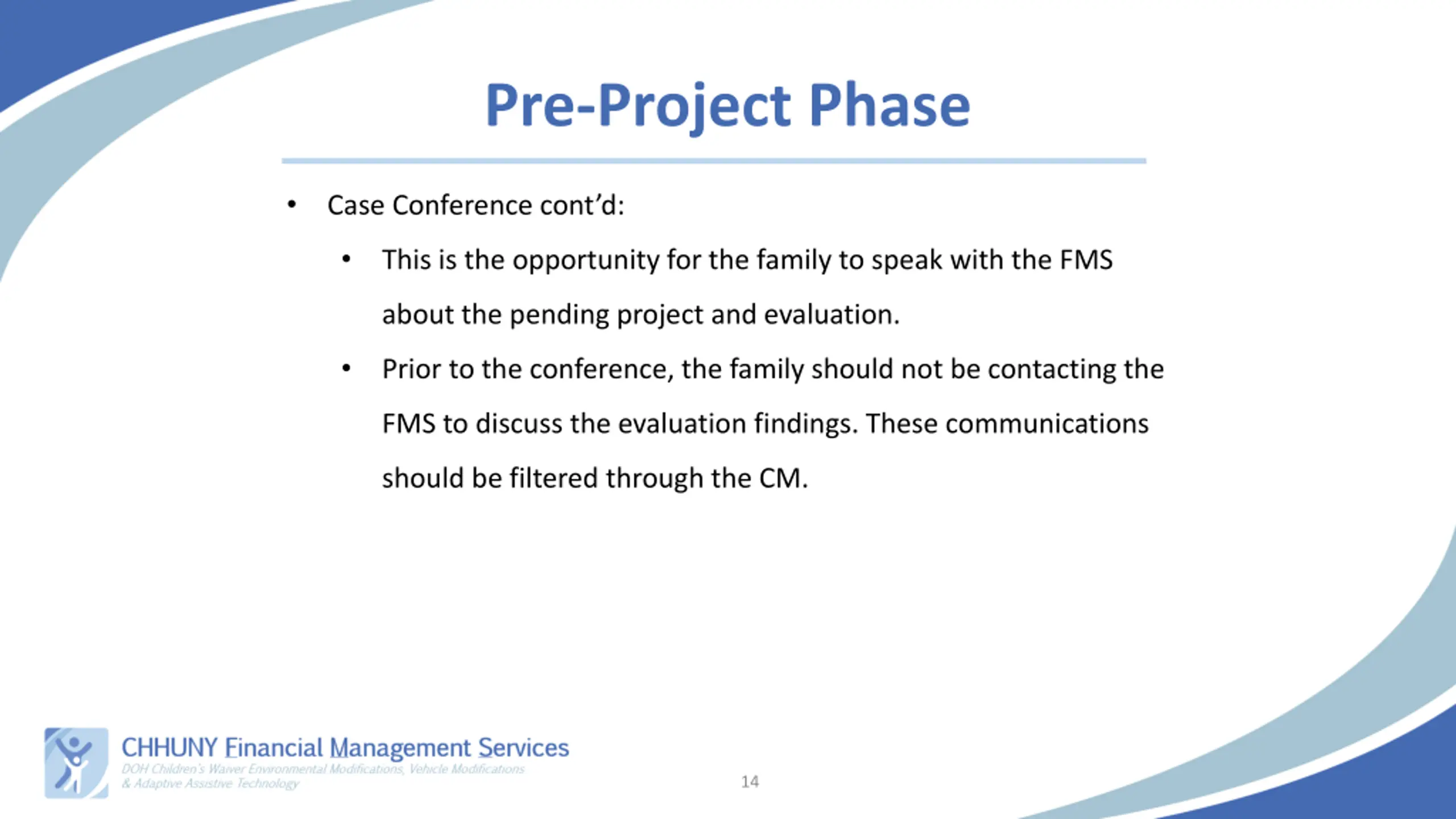 Pre-Project Phase Case Conference cont d: This is the opportunity for the family to speak with the FMS about the pending project and evaluation. Prior to the conference, the family should not be contacting the FMS to discuss the evaluation findings. These communications should be filtered through the CM. 14