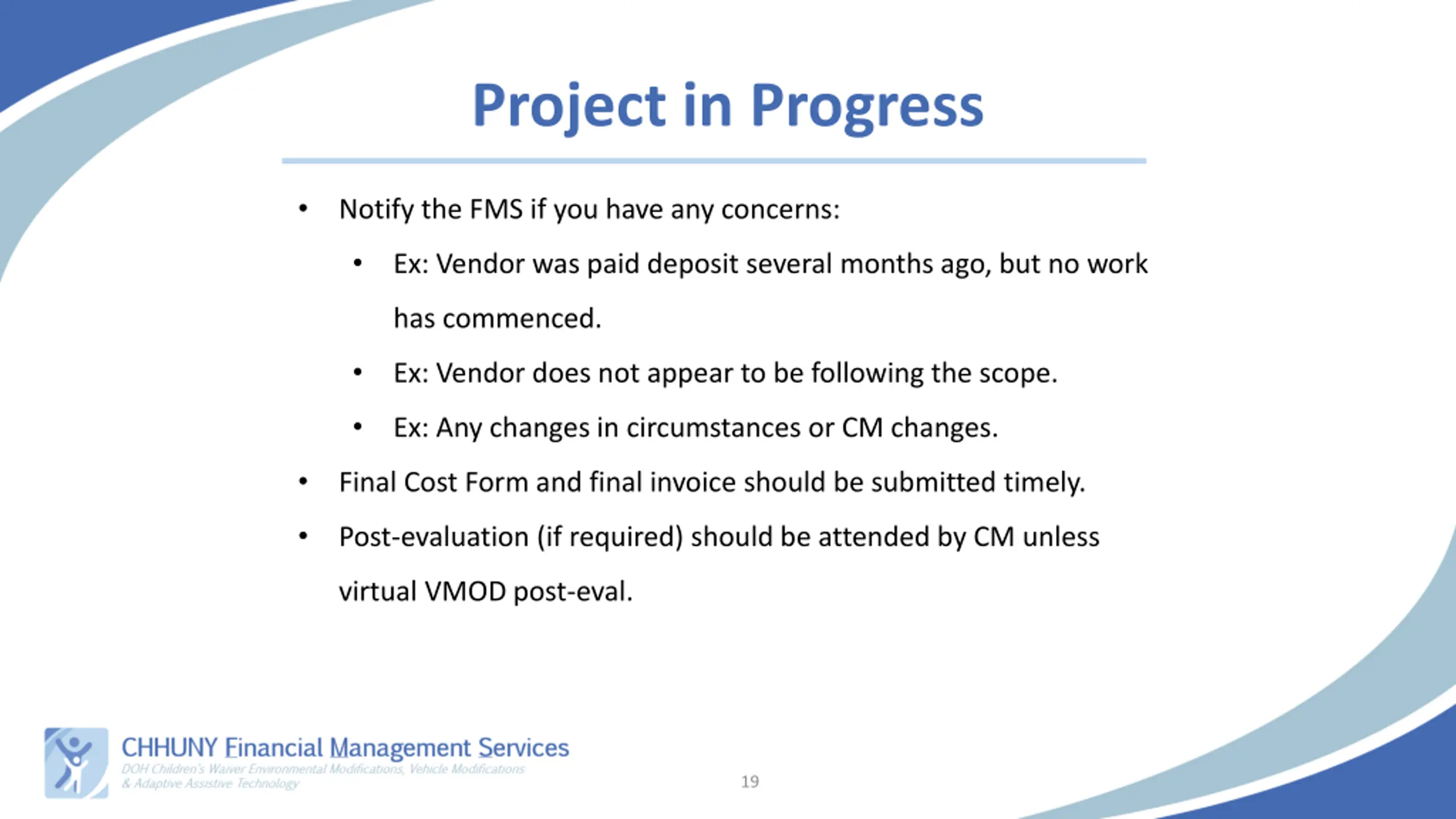 Service Request Phase Packet Submission: The FMS will review for completeness. Incomplete packets will not be accepted. Issues with bids will be referred to the CM to coordinate with the vendor for correction. Ex: Bids should align with the scope identified on the evaluation. Complete packets will be reviewed by the FMS to proceed to bid selection. 2nd case conference is a critical touchpoint for the family, CM, and the FMS to discuss the work that is about to commence! 18