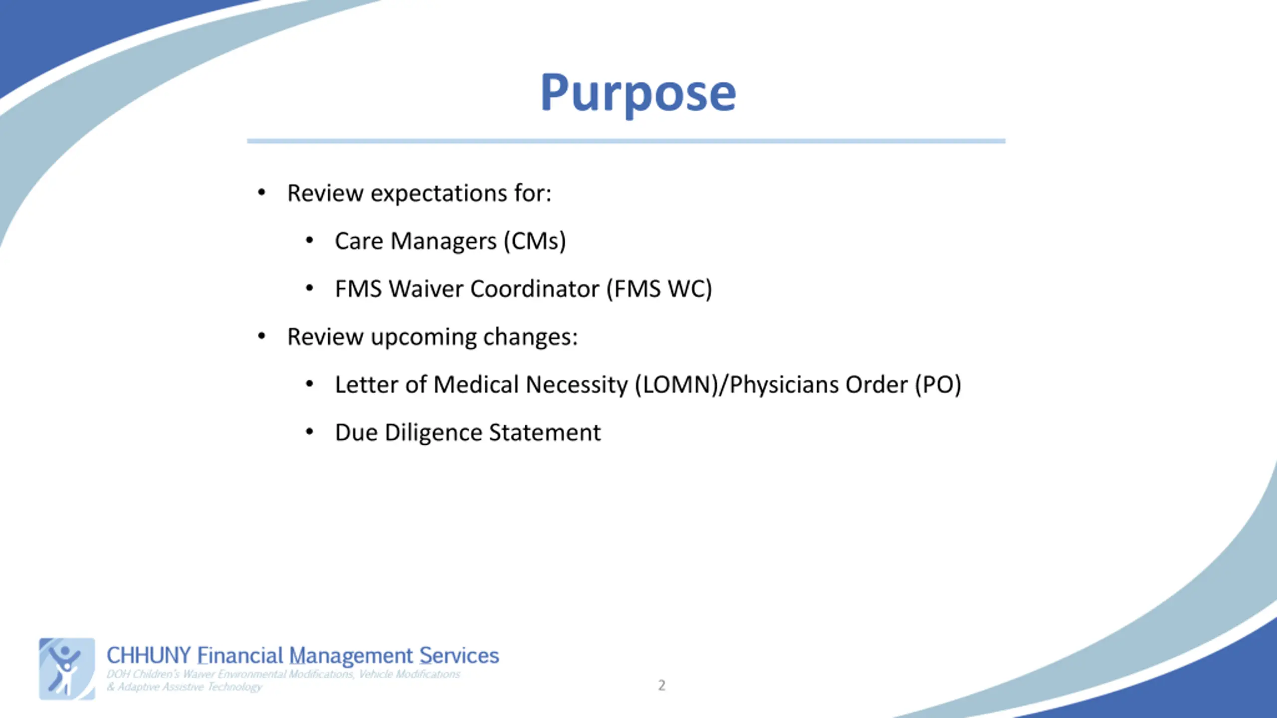 Purpose Review expectations for: Care Managers (CMs) FMS Waiver Coordinator (FMS WC) Review upcoming changes: Letter of Medical Necessity (LOMN)/Physicians Order (PO) Due Diligence Statement 2