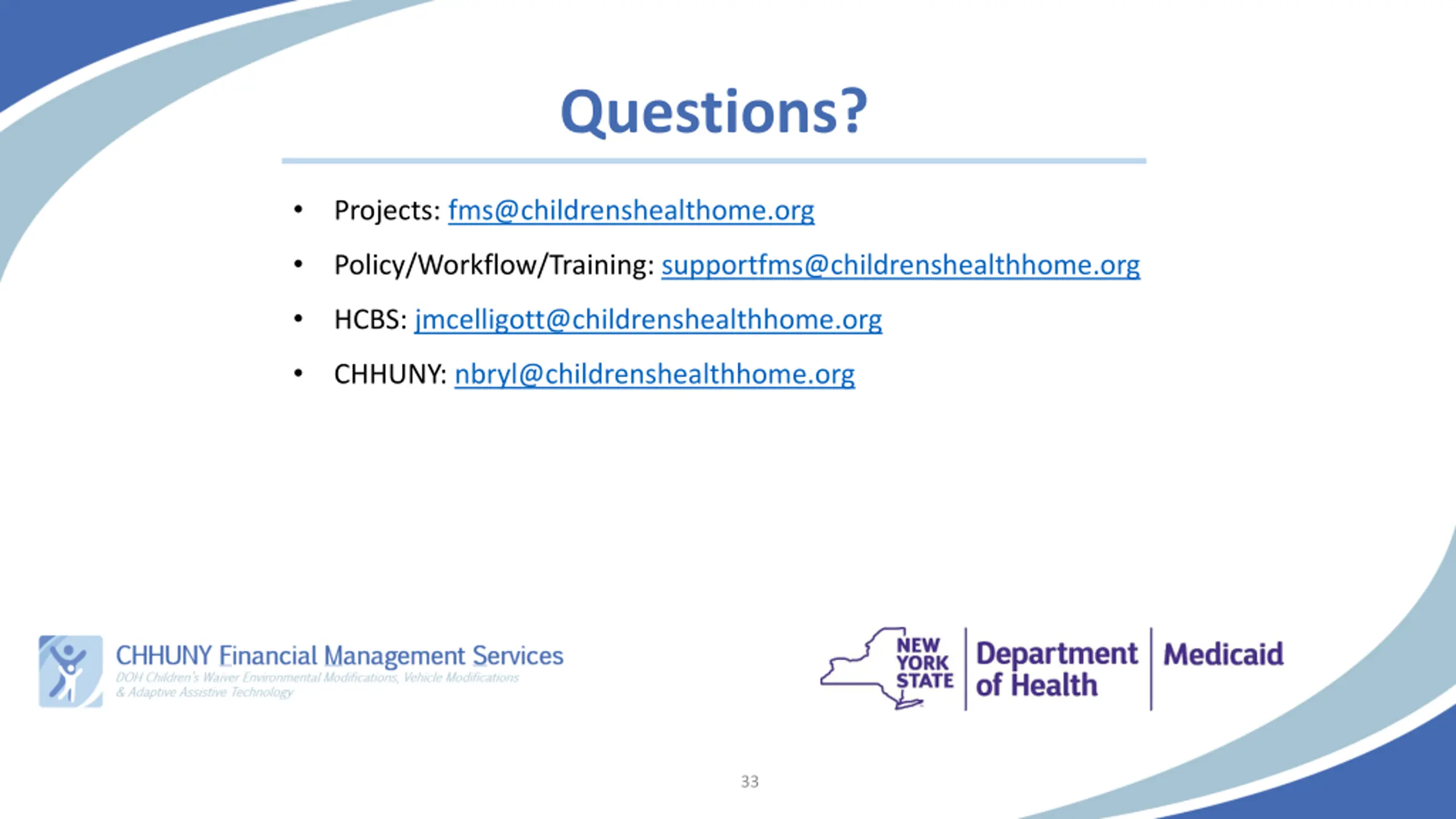 Questions? Projects: fms@childrenshealthome.org Policy/Workflow/Training: supportfms@childrenshealthhome.org HCBS: jmcelligott@childrenshealthhome.org CHHUNY: nbryl@childrenshealthhome.org 33