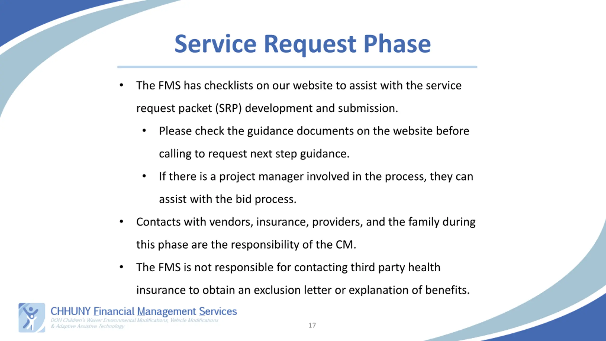 Service Request Phase The FMS has checklists on our website to assist with the service request packet (SRP) development and submission. Please check the guidance documents on the website before calling to request next step guidance. If there is a project manager involved in the process, they can assist with the bid process. Contacts with vendors, insurance, providers, and the family during this phase are the responsibility of the CM. The FMS is not responsible for contacting third party health insurance to obtain an exclusion letter or explanation of benefits. 17